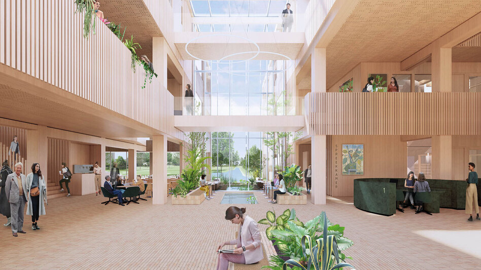 Autour du bâtiment, le stationnement sera aménagé avec des revêtements semi-perméables et un système visible d’évacuation des eaux de pluie. La flore et la faune locales seront également mises en valeur. Les fossés et berges rejoindront l’atrium et amèneront le paysage de polders à l’intérieur. À l’intérieur, la végétation favorisera un climat intérieur sain et verdoyant. Les façades transparentes et les touches de verdure renforceront le lien avec l’environnement.