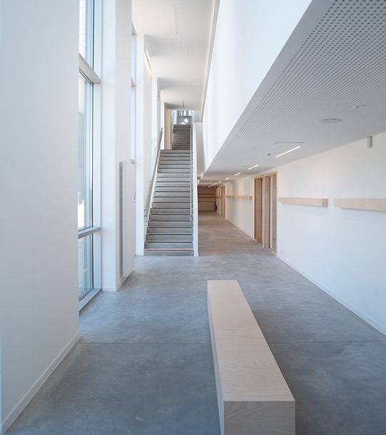 La finition extérieure est prévue en tôles thermolaquées d’acier finement nervurées ou lisses. Un travail sur les proportions avec des parties pleines et ajourées anime les façades du bâtiment. Des panneaux colorés donnent un accent particulier à l’entrée du bâtiment. Les façades vitrées orientées au sud sont pourvues de lamelles pare-soleil fixes protégeant des rayons du soleil verticaux. La salle bénéfice d’une apport généreux de lumière naturelle, tout en évitant l’éblouissement des utilisateurs.