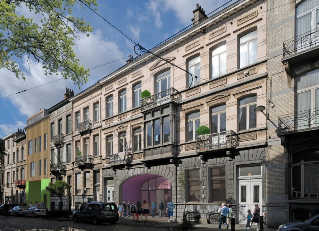 Les maisons bel-étage existantes situées rue Van Oost, qui font partie d’un front bâti cohérent et caractéristique, sont intégrées dans le nouveau projet. Elles sont restaurées et transformées en petits immeubles d’appartements, disposant chacun de son propre accès à la rue et distincts des fonctions publiques implantées rue Navez et en intérieur d’îlot. Une maison mitoyenne délabrée est démolie et remplacée par une nouvelle construction qui permet le passage vers les écoles et vers la cour de récréation. La deuxième entrée des écoles est située à front de rue Navez, fermant un terrain non bâti occupé initialement par une cour de service de l’ancienne brasserie.
