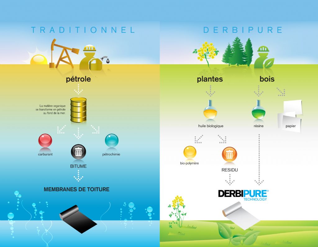 Derbigum s’est déjà posé cette question et s’y est déjà préparé. La membrane d’étanchéité blanche réfléchissante Derbipure® a ainsi été lancée sur le marché en 2010. Il s’agit de la première membrane d’étanchéité pour laquelle aucune goutte de bitume n’a été utilisée, mais pour laquelle un mélange spécial d’huiles et résines végétales a été mis au point. Ce produit est jusqu’à présent la seule membrane d’étanchéité au monde à base de ressources végétales et représente une alternative à part entière aux toitures bitumeuses.