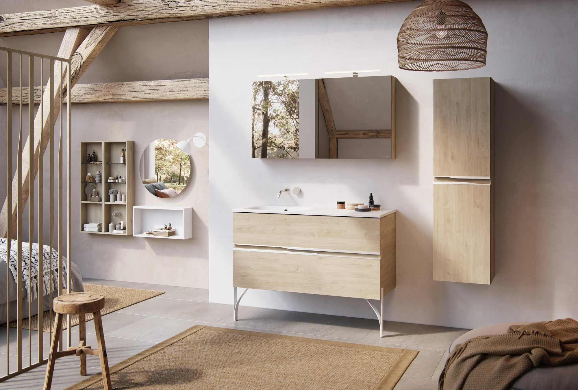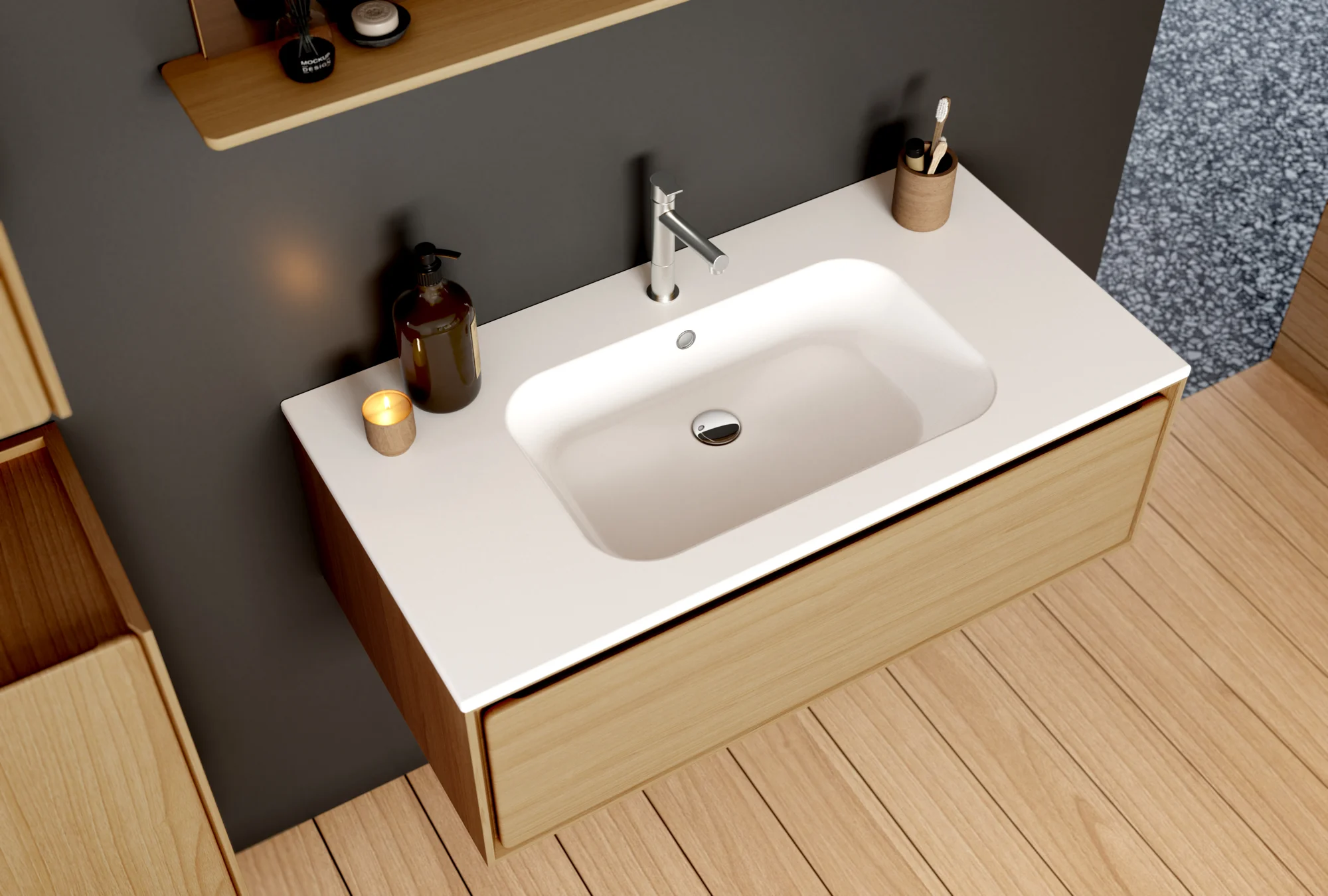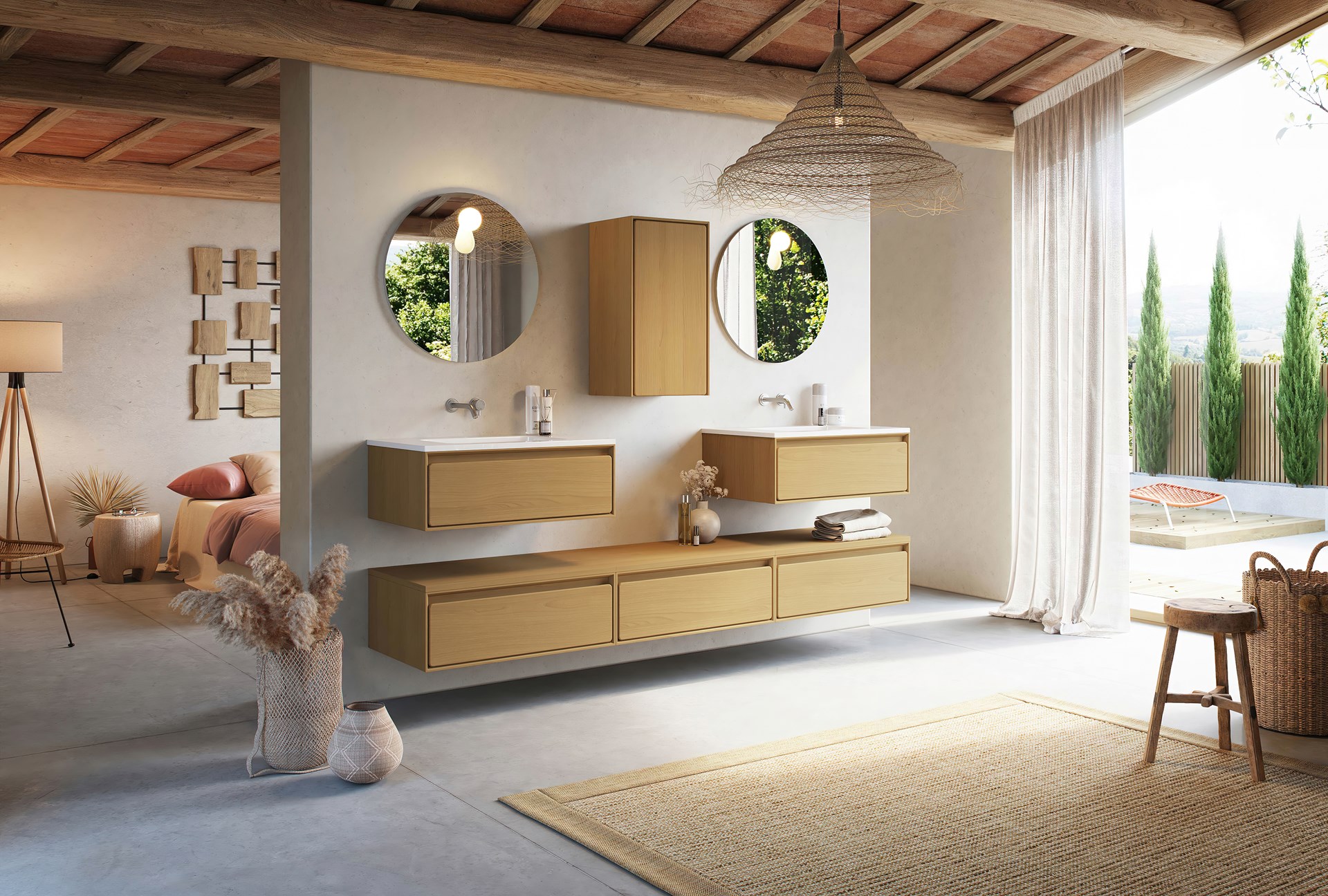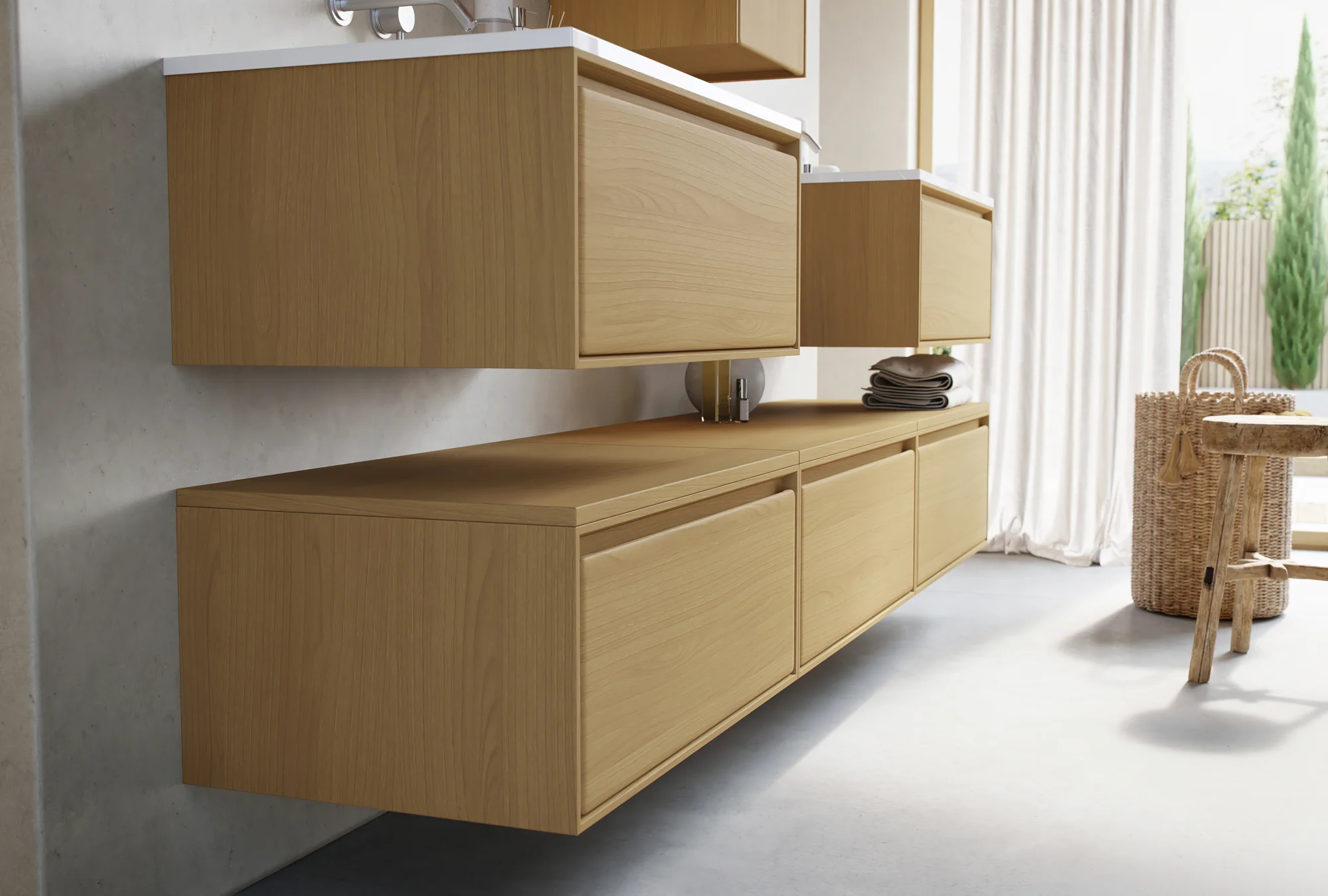 Également en exclusivité chez Facq, la série Epic de Sanijura sublime le bois massif dans la conception de meubles de salle de bains. Fusionnant des formes géométriques et organiques, façades courbes et angles subtilement arrondis, l'Epic offre une multitude d'options, sans jamais compromettre la simplicité de l'entretien.