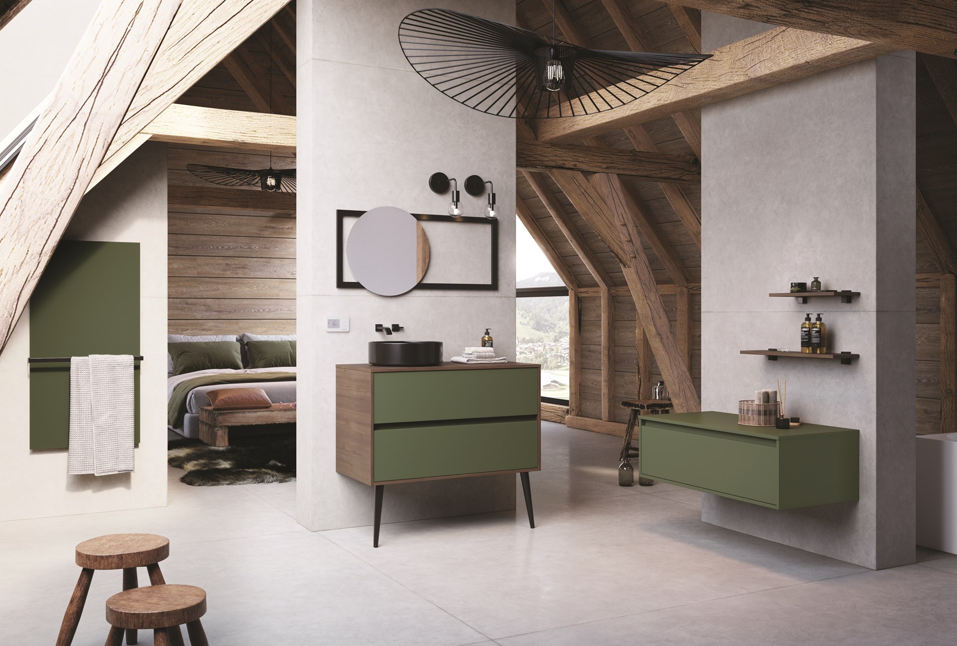 Des teintes classiques comme le Creta (argile) insufflent à la salle de bains un air frais et élégant, idéal pour une association ton-sur-ton avec des surfaces inspirées de la nature, comme la pierre et le bois. Des nuances plus audacieuses comme le Denim Blu, le Verde Felce (vert fougère) ou le Verde Salvia (vert sauge) confèrent une ambiance originale et contemporaine, ouvrant la voie à une multitude de styles.