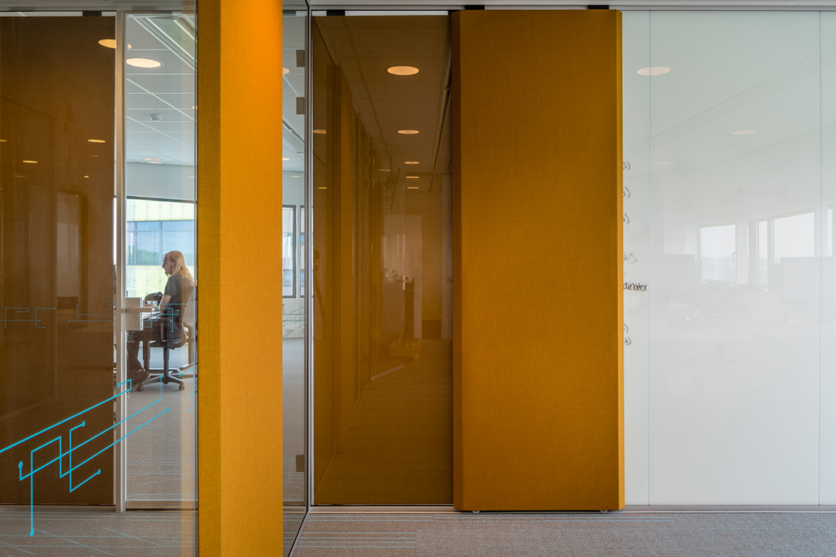 Ce concept modulaire unique a été conçu pour fournir des espaces de bureau avec des aménagements temporaires, avec une absorption acoustique supplémentaire et, si nécessaire, le respect de la confidentialité. Faisant partie d'un innovant système de mur de verre acoustique modulable, ce panneau coulissant acoustique possède un très haut coefficient d'absorption acoustique et un coefficient d'isolation acoustique de 37 à 39 dB. Ce panneau se déplace sur un rail situé dans le plancher tout en étant guidé par un rail supérieur. Il est facile à assembler ou à déplacer et est toujours adapté au mur. Le panneau est également simple à (re)tapisser, il peut ainsi changer d'apparence et vivre plusieurs vies.