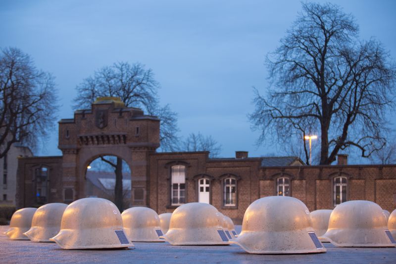 Le champ de casques bien rangés constitue le point de mire de l'exposition ‘Kleine Verhalen in een Groote Oorlog’ (Petites histoires dans une Grande Guerre). En 2014, le projet, réalisé par LensAss architecten et le fabricant Ebema, a été nominé dans la catégorie Small Scale Precast des FEBE Elements.