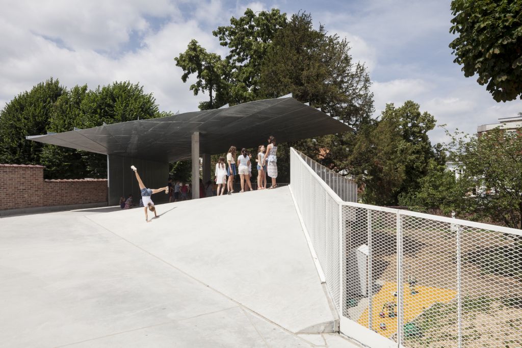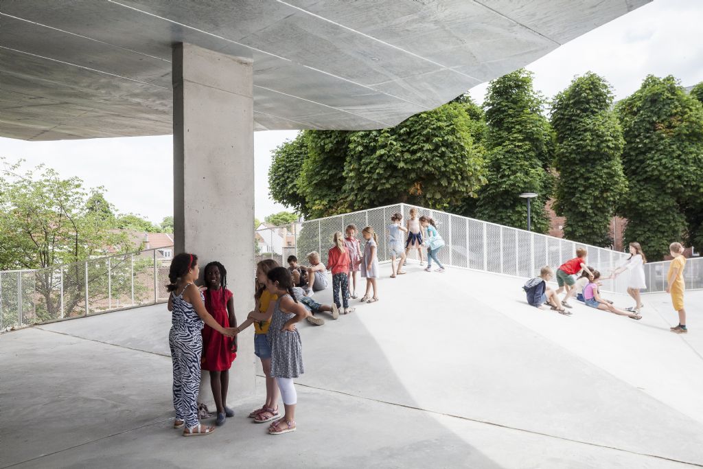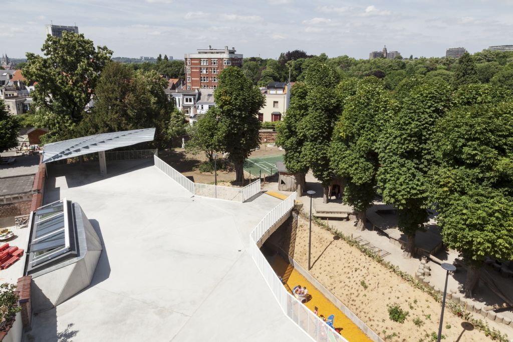 Extension d’une crèche existante de 38 à 82 enfants, située sur un site scolaire avec zone intérieure verte au coeur d’un tissu urbain dense. Pas une sinécure étant donné qu’un tel programme d’extension est de nature à avoir un impact immense sur l’espace libre du site scolaire. Le choix s’est porté sur une grande extension en sous-sol qui vient se raccorder au jardin en contrebas. En concevant l’extension semi-enterrée, l’impact est minimal et le toit peut devenir une plaine de jeu aventureuse. L’extension héberge 4 groupes d’âges reliés entre eux par une ruelle intérieure de jeu formant un méandre. Chaque espace ouvre sur un espace extérieur avec talus qui fait la liaison avec la plaine de jeu.