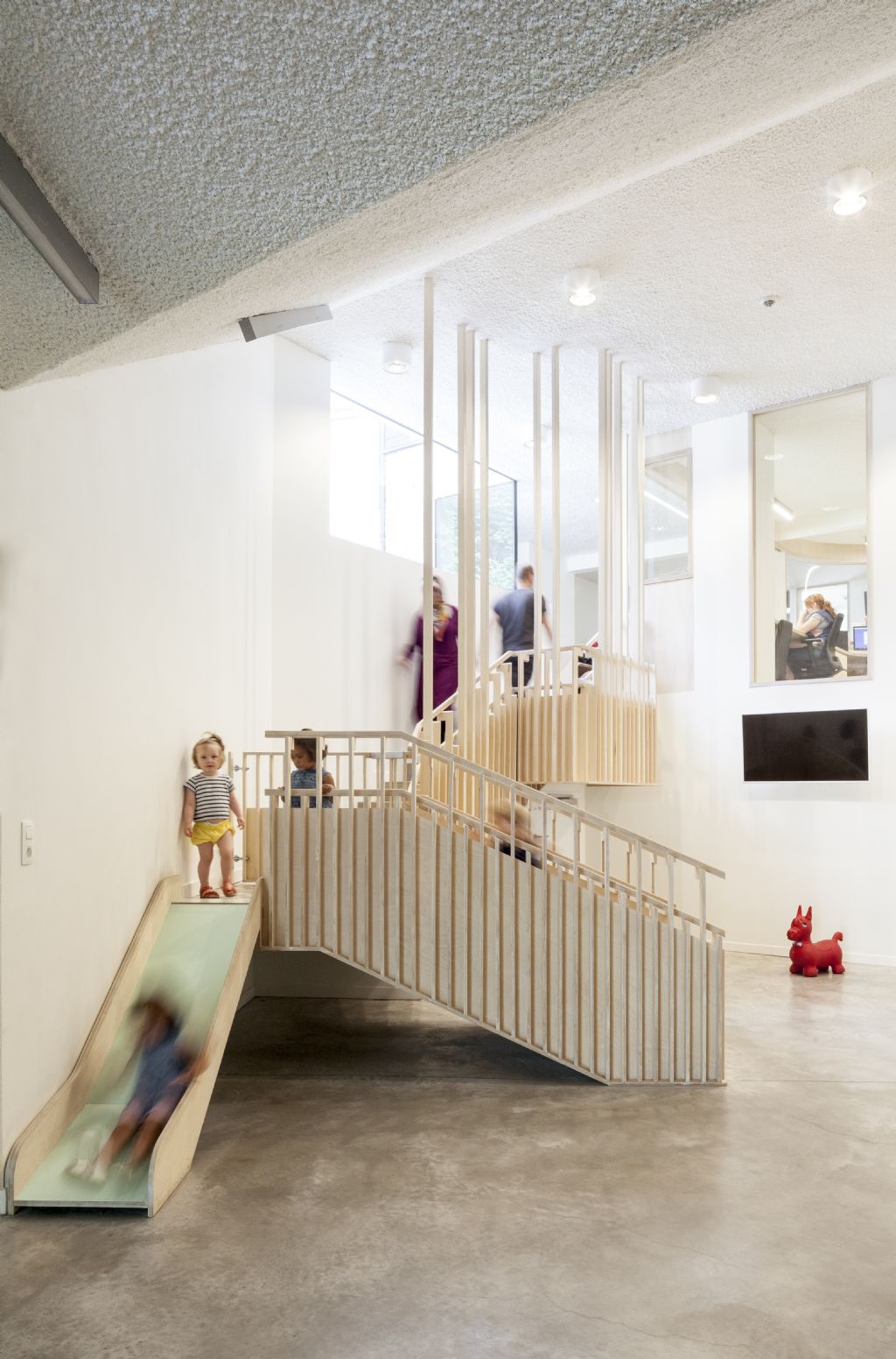 La particularité de ce projet est l’implantation semi-enterrée de la crèche, qui donne à l’arrière sur un jardin situé en contrebas. La toiture de la crèche est intégralement utilisée comme plaine de jeu. Les quatre groupes d’âges disposés 2 par 2 sont entièrement vitrés côté jardin. Cette façade orientée nord donne sur un talus baigné de lumière toute la journée. Le grand avantage est qu’il n’est pas question de surchauffe. Pour faire pénétrer la lumière profondément dans le bâtiment, le toit s’élève en deux endroits pour former deux pavillons. Au niveau de la plaine de jeu, cela crée des plans inclinés qui transforment le toit en parc d’aventures.