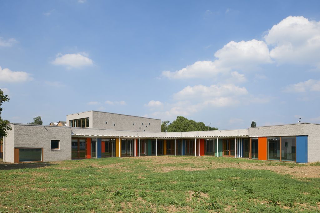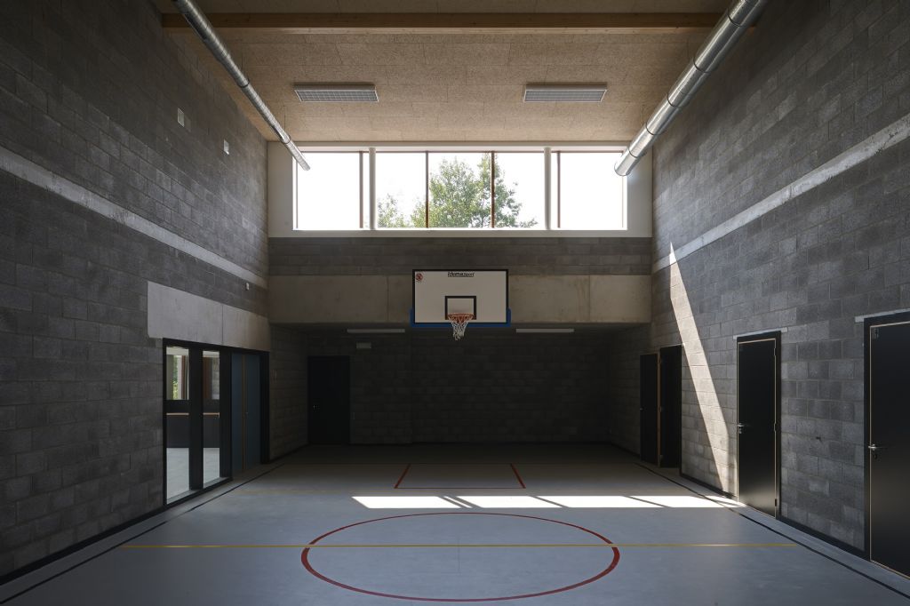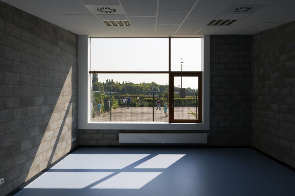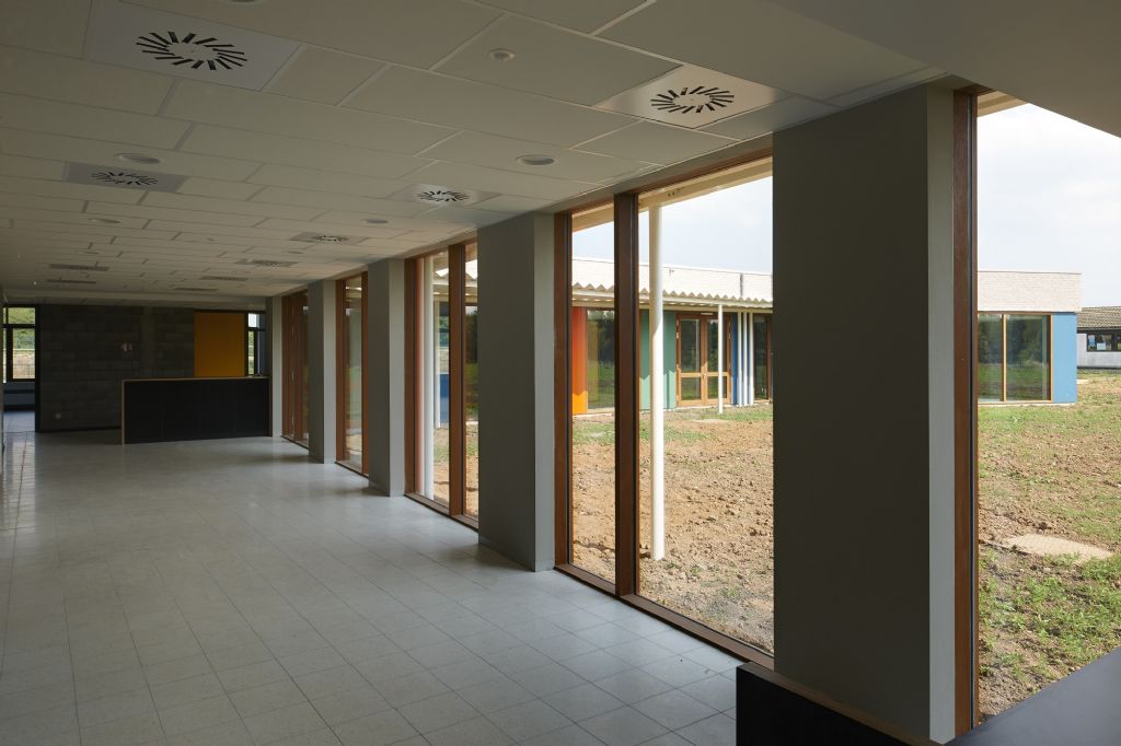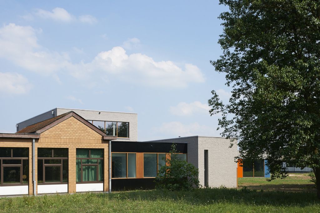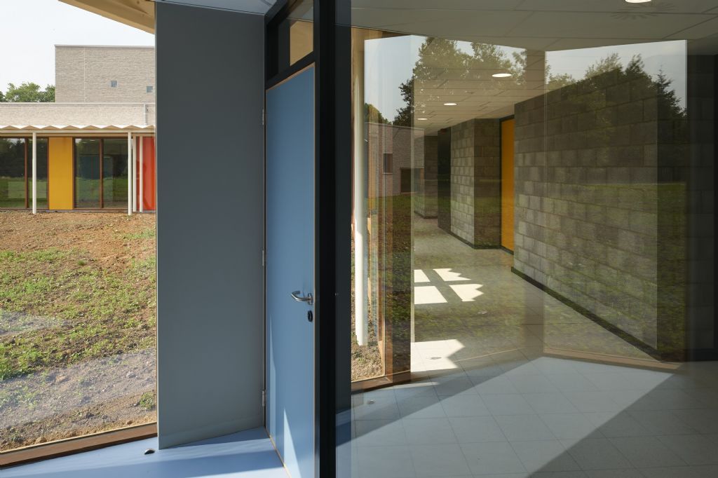 A l’échelle du site, l’école fondamentale se trouve à l’entrée du site. La nouvelle entité formée s’étire horizontalement sur un axe nord-sud, vers le secondaire et se ramifie selon un axe secondaire Est-Ouest. L’école est remodelée, (re)ancrée au site qu’elle colonise, se mettant en sympathie avec le paysage qui l’entoure. Malgré une typologie de plain-pied inhérente à la fonction d’école spéciale et un facteur de forme relativement défavorable, les valeurs Ew de 65 KWh/m²/an et K24 sont atteinte pour l’extension. Les parements extérieurs sont majoritairement composés de maçonneries de brique - teinte grise avec joints beurrés, à l’exception des façades vers jardin, présentant un ensemble de menuiserie bardé de tôles en acier laqué dans une gamme de quatre couleurs. Les auvents, couvrant l’entrée principale et la façade vers jardin sont, quant à eux, en acier laqué blanc. Les menuiseries extérieures sont réalisées en afzélia. À l’intérieur, dans un soucis de longévité, les murs des classes, de la salle de sport et des circulations sont laissés en blocs apparents. Seules quelques zones choisies sont enduites en blanc pour optimiser l’apport de lumière naturelle. Les entrées des classes sont également traitées de manière différenciée, profitant de tôles d’affichage en acier laqués et de menuiseries peintes. Les revêtements de sol choisi sont le carrelage granito pour les circulations, le linoléum pour les classes et les bureaux ainsi qu’un caoutchouc acoustique pour la salle de sport.