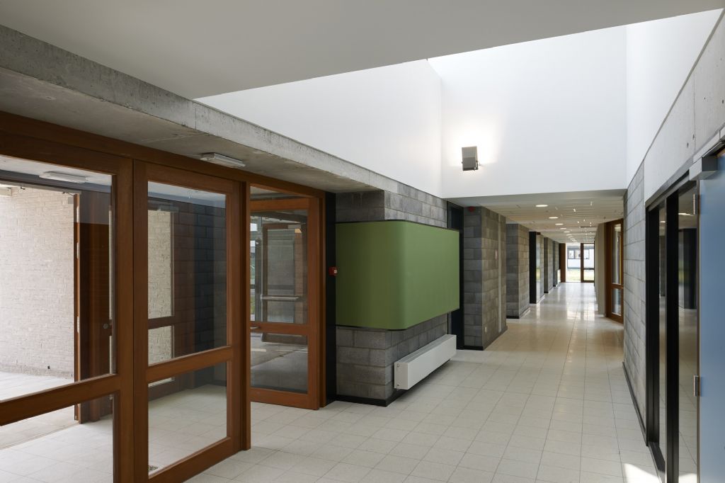 Plutôt que de générer une organisation bicéphale, les architectes ont choisi de légèrement glisser le centre de gravité de l’école existante et de le renforcer en accolant les fonctions communautaires du programme de l’extension à l’atrium existant. Une distribution simple traversant l’ensemble de l’école est ainsi créée. En parallèle, le prolongement de l’aile administrative et paramédicale est réalisé. L’implantation a été choisie parce qu’elle ouvre la voie à différents schémas de développement futurs pour l’école, sans jamais hypothéquer les fondements, la proposition réalisée. Que du contraire, puisque cet accolement à l’existant permet diverses économies du fait de la réduction des circulations, du regroupement des locaux techniques, de la suppression de la façade nord de l’extension et donc de la réduction du volume de déperdition. D’autre part, l’intervention sur le bâtiment existant met à profit des m² existants en les réaffectant ou en en optimisant l’organisation à moindre frais.