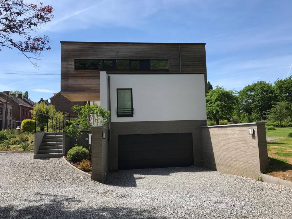 D’un point de vue énergétique, le projet a été complètement pensé afin d’obtenir une habitation de type basse énergie. La maison existante a été entièrement isolée et les techniques spéciales ont été entièrement remplacées (ventilation avec récupération de chaleur, chaudière à condensation au gaz, etc. ...). D’un point de vue planimétrique, l’extension « cuisine » a été réalisée sur la partie gauche de la maison, en relation directe avec la salle-à-manger agrandie au profit de l’ancienne cuisine démontée. L’extension « chambre » a été réalisée à l’arrière de la maison dans le but de profiter de vues vers le jardin et d’une intimité par rapport à la voirie. Celle-ci a été imaginée comme une greffe au corps de bâtiment existant afin d’unifier l’ensemble par le biais d’une série de volumes qui s’emboitent. Enfin, l’extension « cabinet médical » a été réalisée sur la partie droite de la maison avec un accès séparé qui est clairement identifié par la présence du volume supérieur en bois.