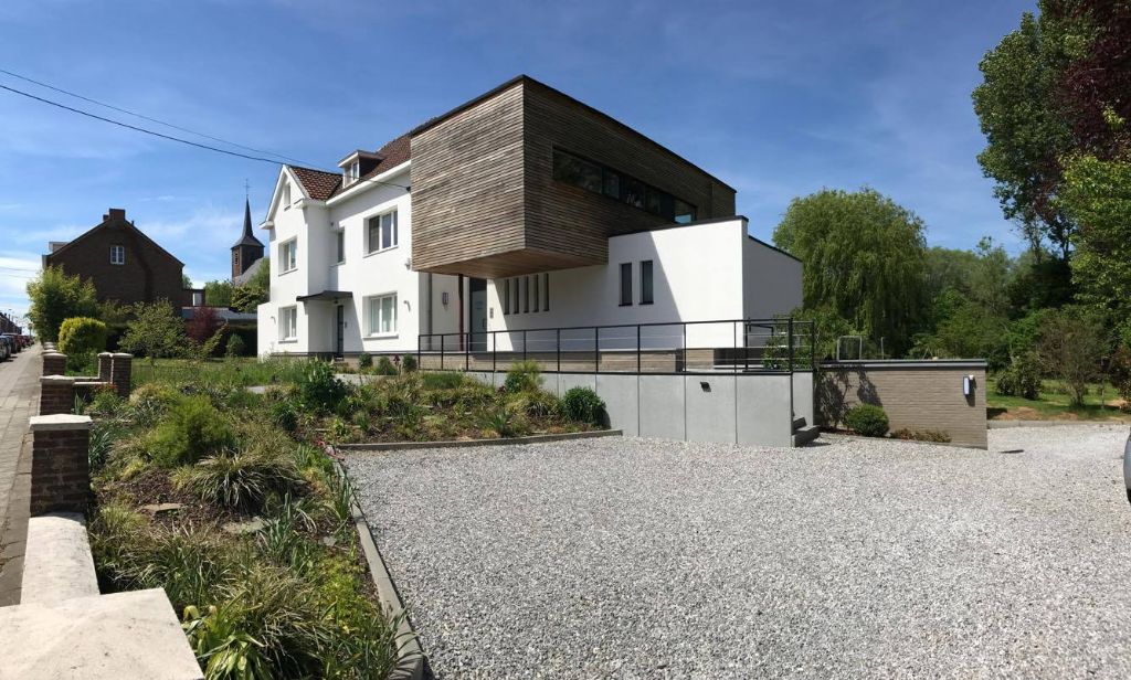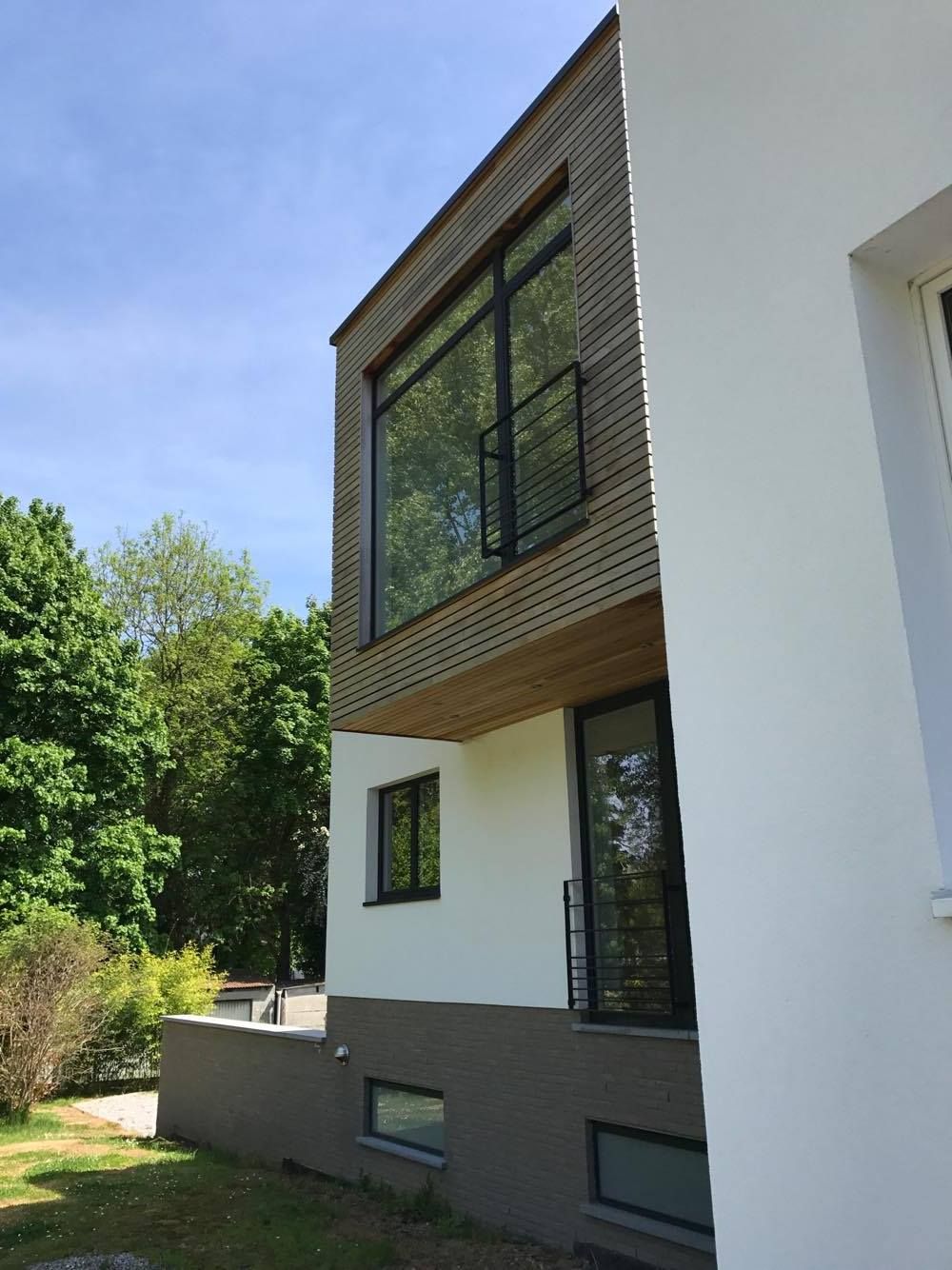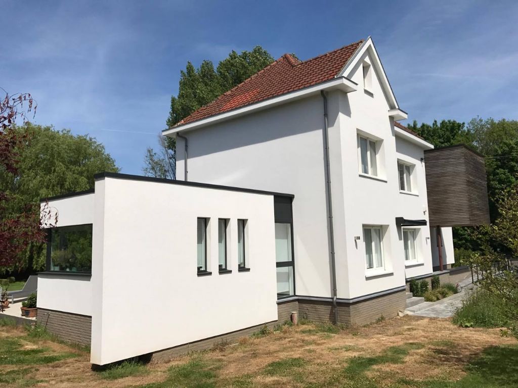 Différentes étapes ont guidé l’élaboration du projet. Premièrement, les extensions ont été visuellement détachées de la maison existante par le biais de failles vitrées. Celles-ci renforcent ainsi l’identité propre de l’habitation existante. Deuxièmement, les deux extensions latérales s’unifient par la réalisation d’un mur de façade continu les connectant visuellement de chaque côté de la maison. Au travers de ce mur, des baies de type meurtrières ont été imaginées afin de conserver l’intimité de l’intérieur de la maison depuis la rue. A l’arrière, les volumes s’ouvrent entièrement vers le jardin de par la multitude de baies vitrées variées, dynamisant la façade. Troisièmement, afin d’identifier la transformation, un parallélépipède rectangle en bois, a été posé à l’étage. Ce volume agit tel un marquage temporel et un appel visuel. Il constitue un geste architectural qui marie deux époques entres-elles. Enfin, l’ensemble des constructions (neuves et existantes) ont été unifiées par la réalisation d’un parement de ton blanc et d’un soubassement en briques. Ce dernier est continu sur les façades et se prolonge à certains endroits en tant que mur d’abords ou de soutènement.