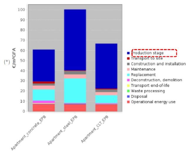 Egalement pour l'immeuble d'appartements, trois variantes de construction ont été comparées: l’acier, le béton et le CLT ('cross laminated timber'). En moyenne, les matériaux sont responsables d'environ 90 % de l'impact environnemental, tandis que la consommation d'énergie dans la phase d'utilisation représente 10 %. Cependant, il existe des différences évidentes entre les trois variantes, notamment en termes de coûts environnementaux pendant la phase de production. Dans le cas du béton, il est presque deux fois moins élevé que dans le cas de l'acier et presque 30 % moins élevé que dans le cas du CLT.