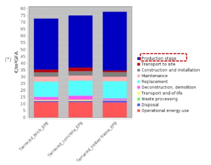 Dans le cas de la maison mitoyenne, trois techniques de construction ont été comparées : la brique, le béton et l’ossature bois. La différence de coûts environnementaux entre les trois variantes s'est avérée insignifiante, c'est-à-dire inférieure à 5 %. Le béton occupe la position intermédiaire entre la brique et l’ossature bois. En moyenne, 85% du coût environnemental provient des matériaux et 15% de la consommation d'énergie pendant la phase d'utilisation. Il convient toutefois de noter que la version actuelle de TOTEM n'offre pas encore la possibilité de prendre en compte les avantages de l'inertie thermique.