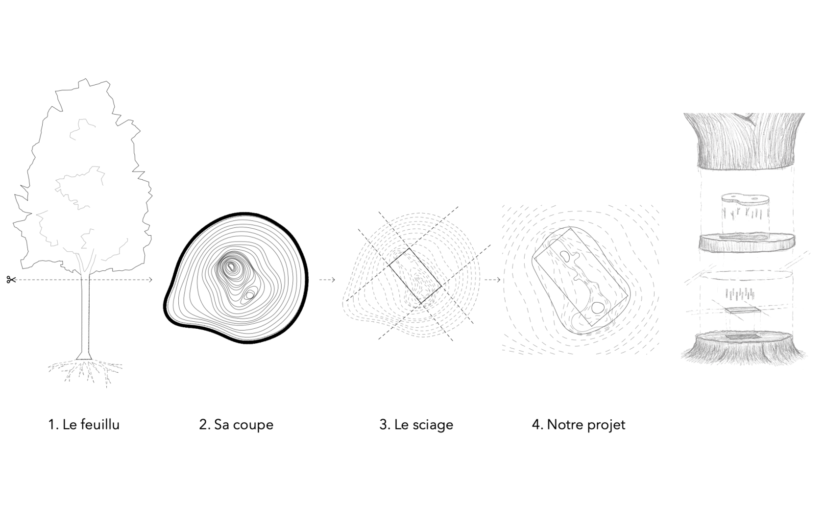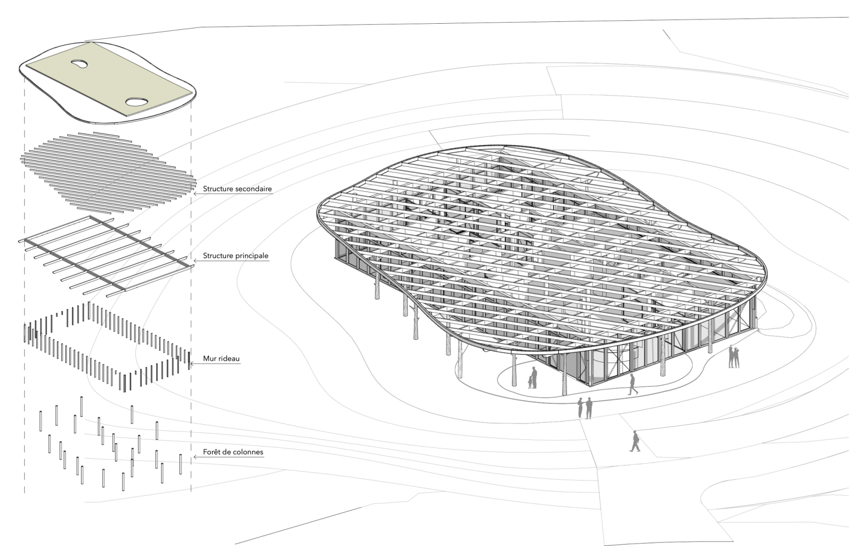 L’un des choix majeurs du projet concerne la structure portante, entièrement réalisée en bois feuillu. Pour se faire, quatre essences locales ont été retenues : le chêne, le hêtre, le bouleau et le peuplier. Elles seront mises en œuvre sous forme d’éléments lamellés-collés. Ce choix s’appuie sur les résultats de plusieurs projets de développement menés par la filière et vise à illustrer le potentiel du bois feuillu utilisé en structure. Le bâtiment constitue ainsi un exemple concret pour démonter la diversité des usages et des produits que la filière bois feuillu peut offrir.