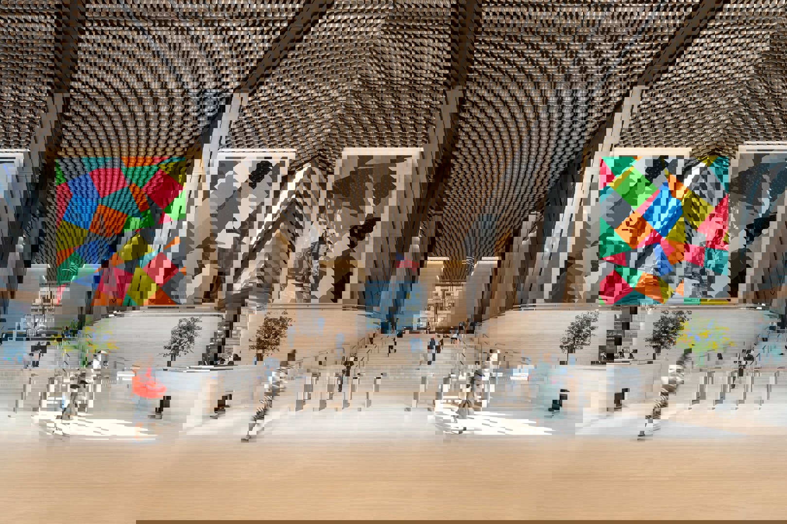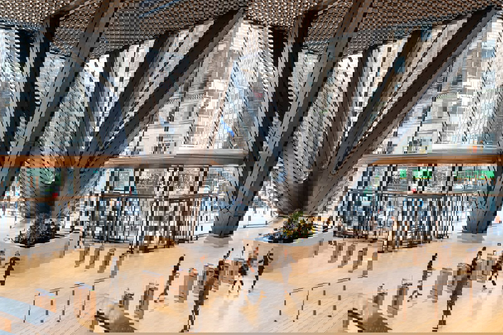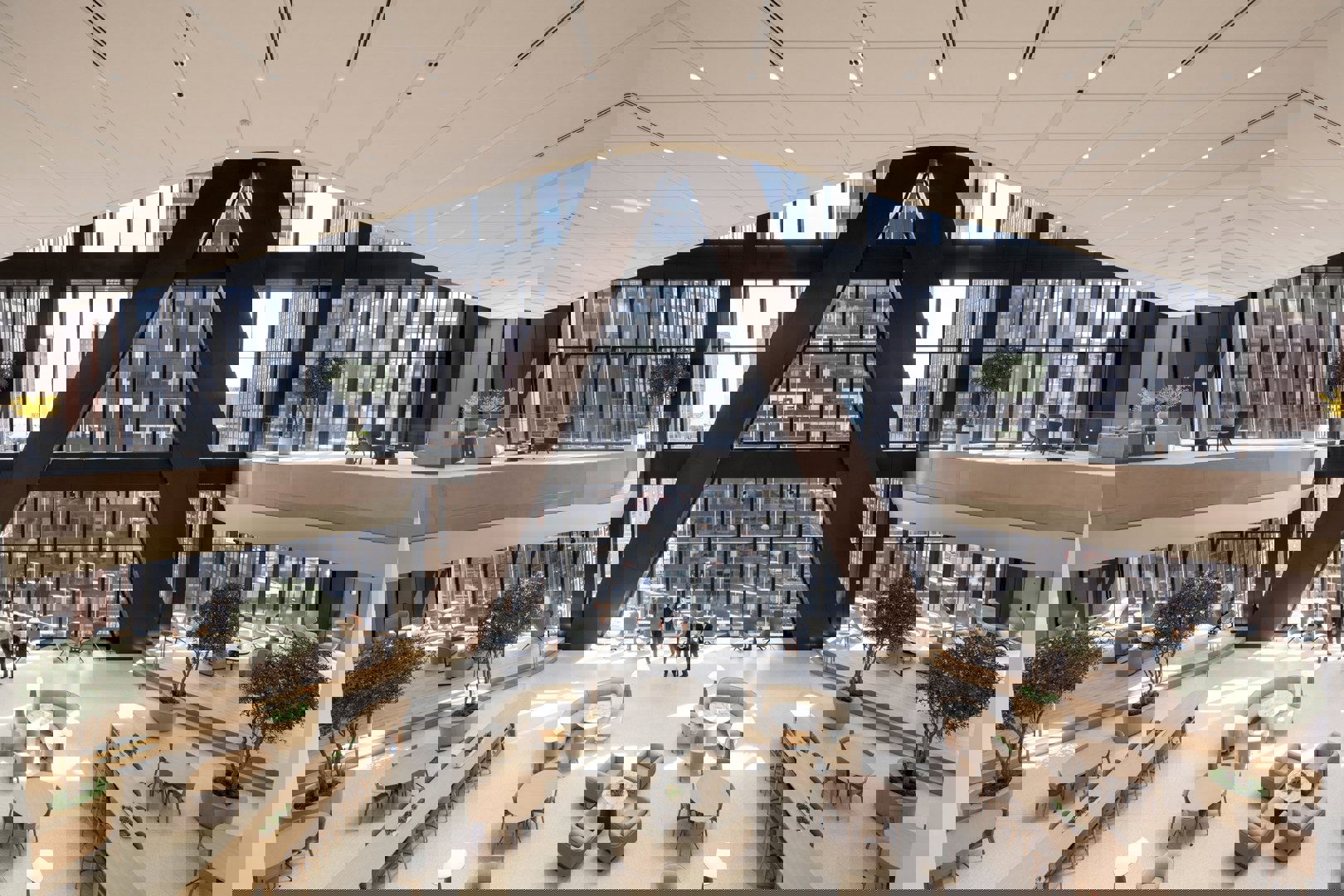 « La structure en porte-à-faux, habillée de bronze, offre un espace public d’une ampleur inédite », explique le fondateur de Foster + Partners. « Avec ses volumes baignés de lumière naturelle et un air intérieur filtré deux fois plus que les exigences réglementaires, ce bâtiment fixe de nouveaux standards de bien-être au travail. »