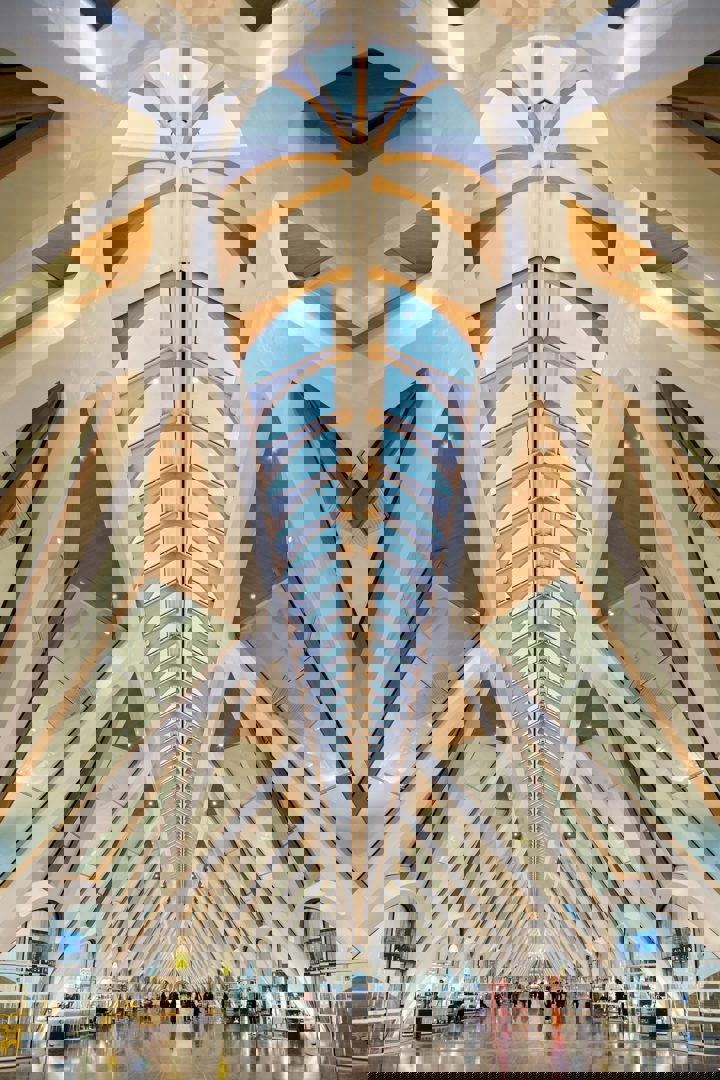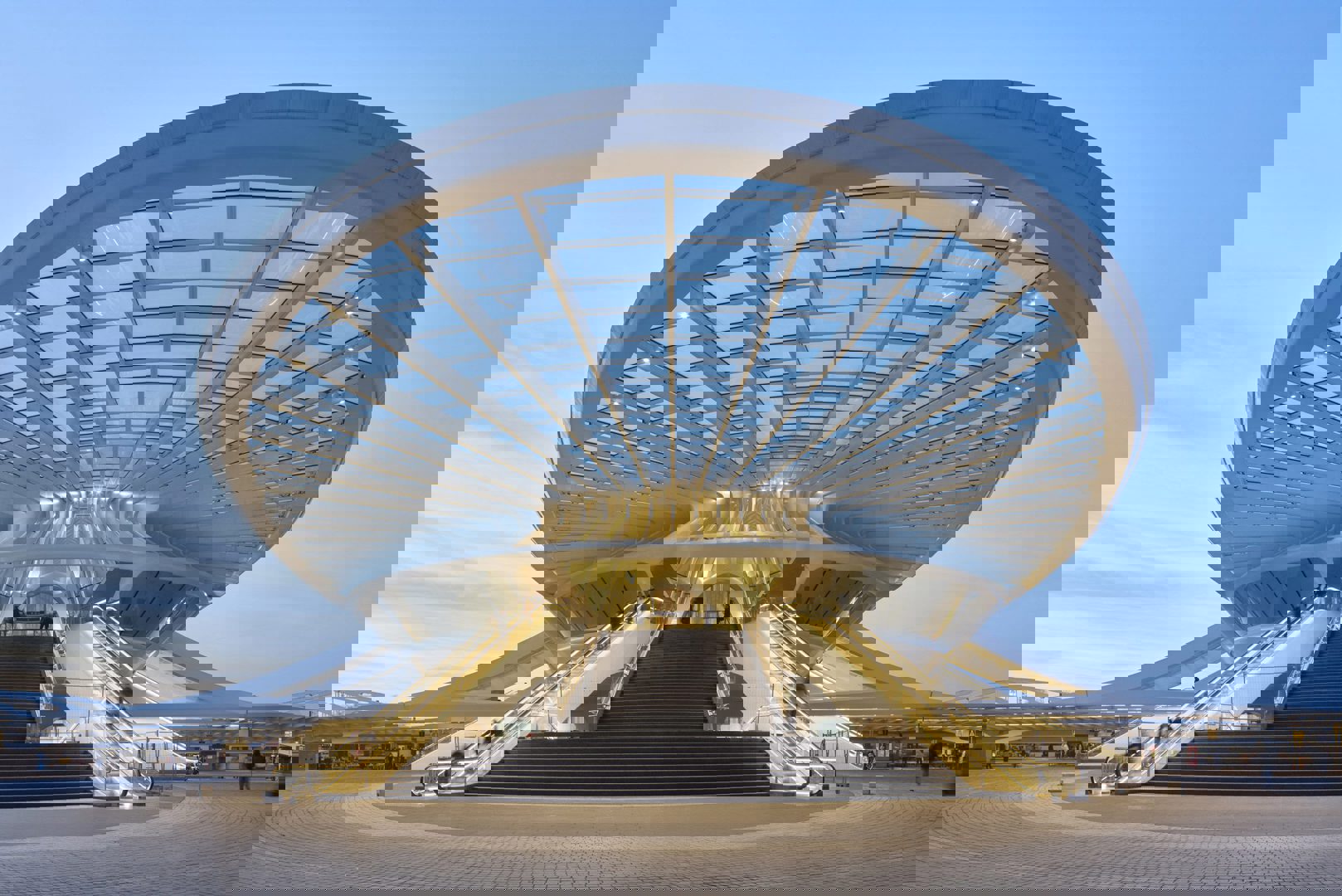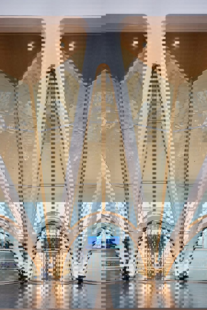 À l’intérieur, Calatrava met en scène une structure triangulée apparente, relevée par des détails en bois et un sol en pierre bleue. Un puits de lumière ouvrant, installé au faîte de la galerie, optimise apport lumineux naturel et ventilation, tout en renforçant la transparence recherchée dès la conception. Les espaces publics – commerces, circulations, accès aux quais – bénéficient ainsi d’un environnement lumineux et lisible pour les usagers.