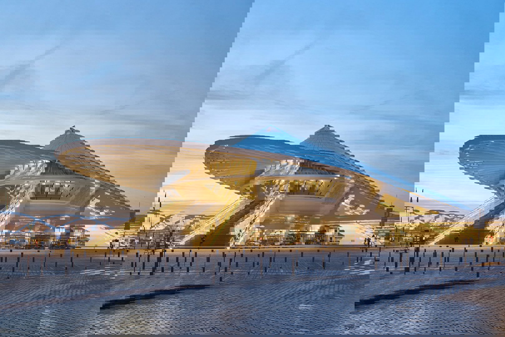 Sous le niveau principal, la gare intègre deux parkings souterrains et un espace pour 200 vélos, assurant une offre intermodale complète. Les infrastructures extérieures comprennent sept voies ferroviaires et 29 arrêts de bus, abrités sous la toiture prolongée du volume central. L’ensemble met l’accent sur une mobilité fluide, tout en anticipant les besoins futurs du territoire.