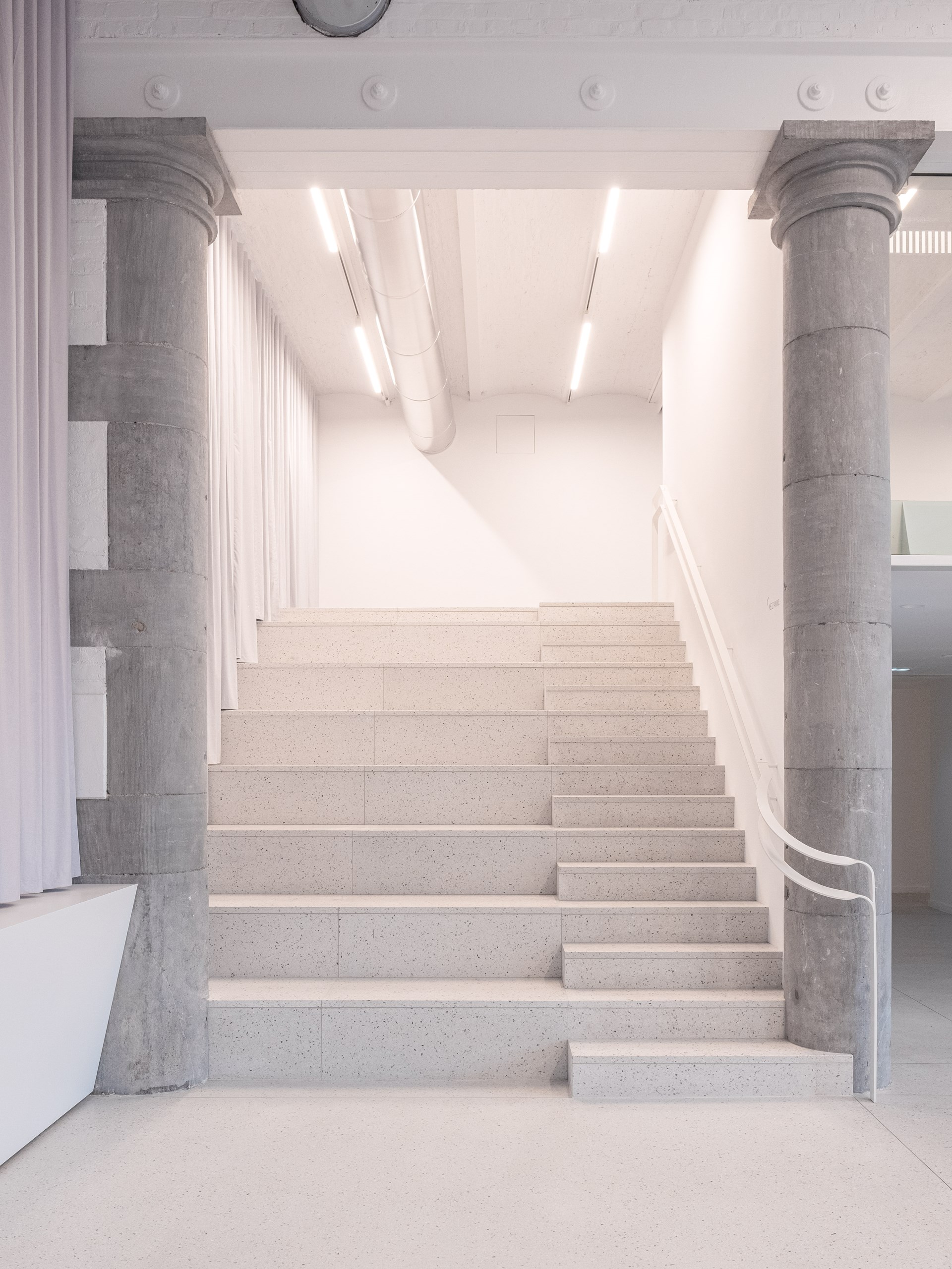 Bâtiment construit en 1887 au sein des casernes Defeld, les écuries sont une des deux ailes restantes du complexe, partiellement démolies pour créer l’esplanade de la police. L’enjeu principal du projet consiste en récréer une nouvelle entrée au bâtiment de manière à asseoir la présence du musée dans le contexte urbain du projet tout en donnant lui conférant un accès direct depuis le boulevard Mayence. A l’intérieur, l’entrée définit le projet. Le niveau intérieur étant considérablement plus bas que le niveau de la rue, un escalier monumental dessert les différents espaces d’exposition – temporaires au rez-de-chaussée et permanents au premier étage – tout en permettant à la fois une relation visuelle plus importante entre ceux-ci et en créant un espace tampon entre exposition et espace public.