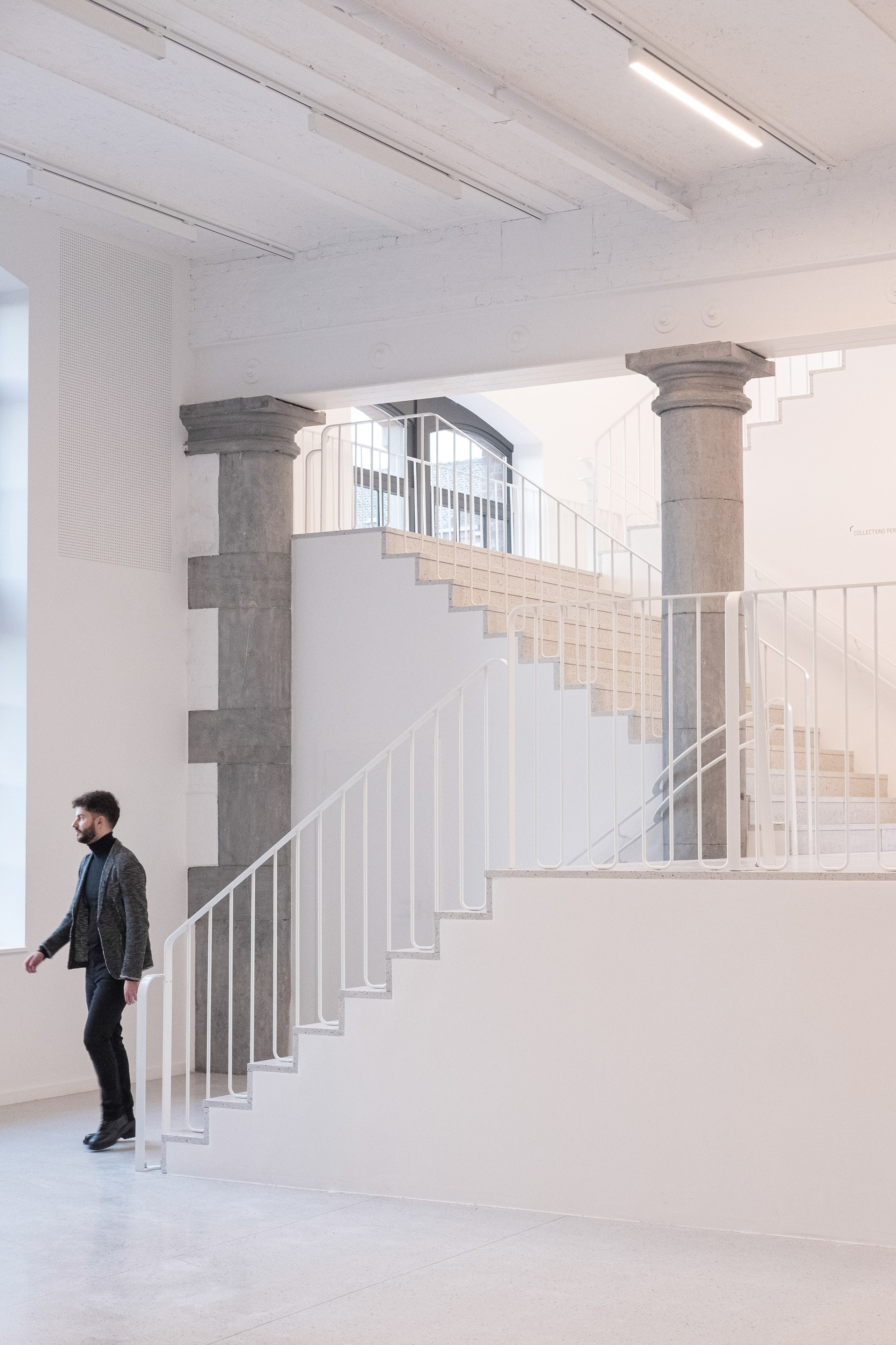 Outre l’entrée monumentale reflétant la présence du musée dans l’espace public, l’approche pragmatique de la gestion des fonctions est également à souligner. Le rez-de-chaussée se compose de deux salles monumentales avec des plafonds à double hauteur, des voûtes en brique et des colonnes en pierre bleue structurant l’espace. La première salle, dans la continuité visuelle de l’entrée, est conçue comme une agora pouvant accueillir les vernissages et autres conférences. Un second espace monumental se situe dans la continuité de l’agora, bien que la transition entre les deux espaces est marqué par un pincement spatial à l’instar d’un sas préservant l’intimité des différentes occupations. Cette seconde salle est dédiée aux expositions temporaires. A cet effet, le mobilier, support des œuvres, est mobile et basé sur la distance séparant les colonnes en pierre permettant de créer divers scénographies.