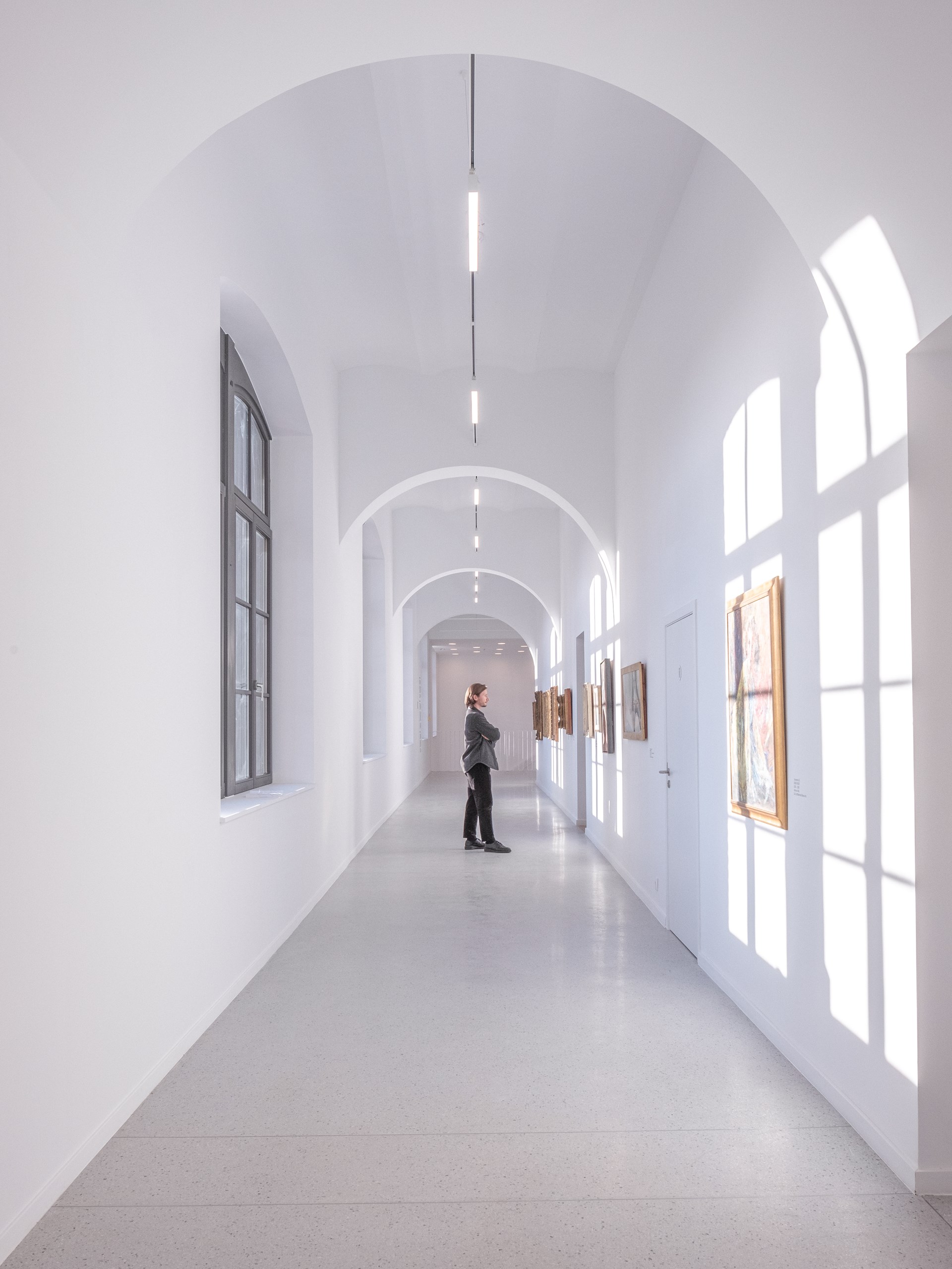 Au premier étage, où la collection permanente est exposée, l’ambiance minérale et ouverte du rez-de-chaussée laisse place à des espaces d’exposition plus intimistes et chaleureux. Les différentes salles, suivant le principe d’antichambres, sont connectées par des ouvertures positionnées et conçues pour souligner la succession et la transition entre les espaces au moyen de baies hautes et étroites. D’autre part, le parcours est accentué par un espace généreux et ouvert tant au début qu’à la fin. Une galerie de portraits ininterrompue ramène enfin le visiteur à son point de départ, l’entrée du musée.