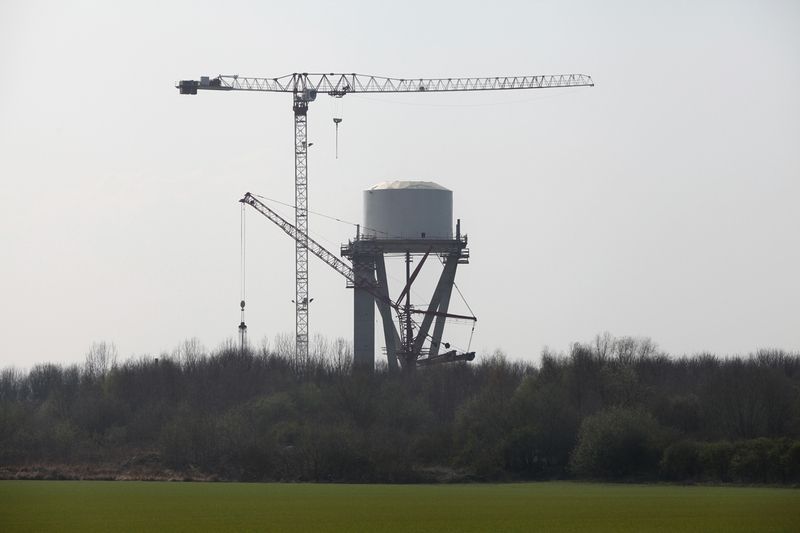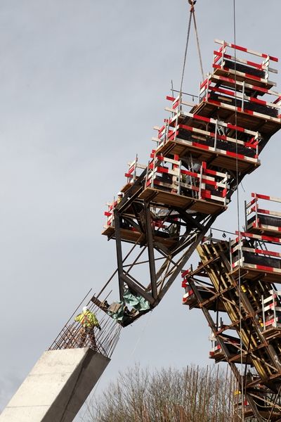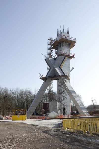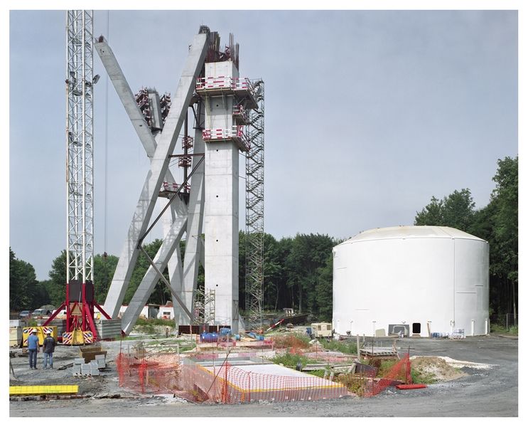 Le chantier de l’entreprise Franki a duré 21 mois. Des pieux de 150 tonnes ont été ancrés à 10 mètres sous le niveau du terrain naturel près des cuves enterrées de la réserve d'eau. Les coffrages particuliers à chaque pied de la structure ont été fabriqués sur mesure. Des tirants provisoires ont été posés pour maintenir les poteaux inclinés en place avant que le plateau supérieur ne soit monté. La cuve préfabriquée au sol a été levée à l'aide d'une grue spéciale et la grille métallique qui l’enveloppe a été posée sur une charpente montée au-dessus d’une résille de poutres en béton précontraint. Celle-ci est suspendue à deux arcs métalliques suivant les diagonales, le tout à plus de 40 mètres de haut. Un chantier impressionnant et d’une grande technicité.