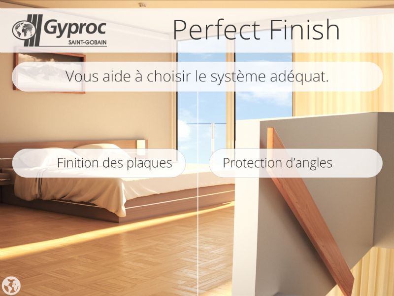 Cette semaine, Gyproc a lancé l’appli Perfect Finish. Cette appli a été développée pour les installateurs, architectes, consommateurs, etc. afin qu'ils prennent connaissance des différentes possibilités pour réaliser la finition d’une cloison Gyproc. L'application se compose de deux parties qui traitent de la finition des plaques et de la protection des angles.