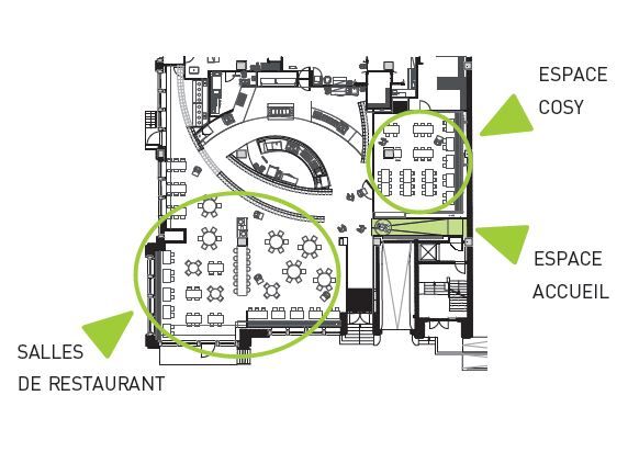 Accessible toute la journée, le restaurant comprend un espace d’accueil avec une faille d’eau qui apporte de la fraîcheur, 3 espaces ouverts communiquant l’un avec l’autre, et un espace plus intime, le cosy, qui avec son système de ventilation indépendant peut être fermé par des cloisons amovibles. Un cocon au centre du restaurant attire le regard dès l’entrée. Il protège le self-service, le cache pour mieux le dévoiler une fois quelques pas franchis. Cet objet, dessiné tout en courbes, joue avec une structure légère recouverte d’une peau en écailles et dirige le flux des clients.