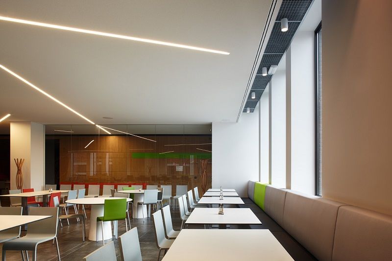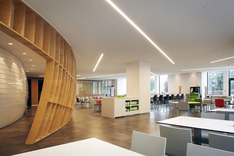 Les qualités acoustiques, les matériaux utilisés, la gestion de l’éclairage ainsi que l’organisation des espaces permettent aux utilisateurs de se sentir bien lorsqu’ils passent un peu de temps dans cet environnement propice à la rencontre et aux discussions entre collègues. L’ensemble des plafonds du restaurant sont des faux-plafonds monolithiques acoustiques qui permettent d’obtenir un confort sonore optimal. La gestion de l’éclairage est assurée par un système Dali-KNX de manière à pouvoir optimiser l’éclairement en fonction de l’ensoleillement et de l’occupation. L’ensemble du restaurant a été conçu en se basant sur les critères environnementaux du BREEAM.