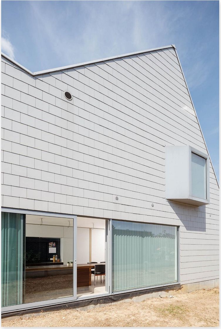 Contrairement aux maisons voisines, les architectes n’ont pas appliqué les prescriptions urbanistiques à la lettre. C’est seulement dans un second temps que le volume créé a été adapté pour rentrer dans les tolérances admises. Pour accentuer les contours particuliers, un bardage monochrome en ardoises gris béton a été choisi. Au départ, les architectes voulaient travailler avec des ardoises en losange pour la connotation de façade provisoire que ce motif semble éveiller chez le spectateur. Mais le maître d’ouvrage n’en a pas voulu, justement pour cette raison. Les architectes se tournent alors vers la pose à claire-voie qui n’a pas été retenue non plus parce qu’elle ne pouvait pas être appliquée sur le toit. Finalement, c’est la pose classique à recouvrement double qui a été retenue, pour l’esthétique uniforme et apaisante du motif.