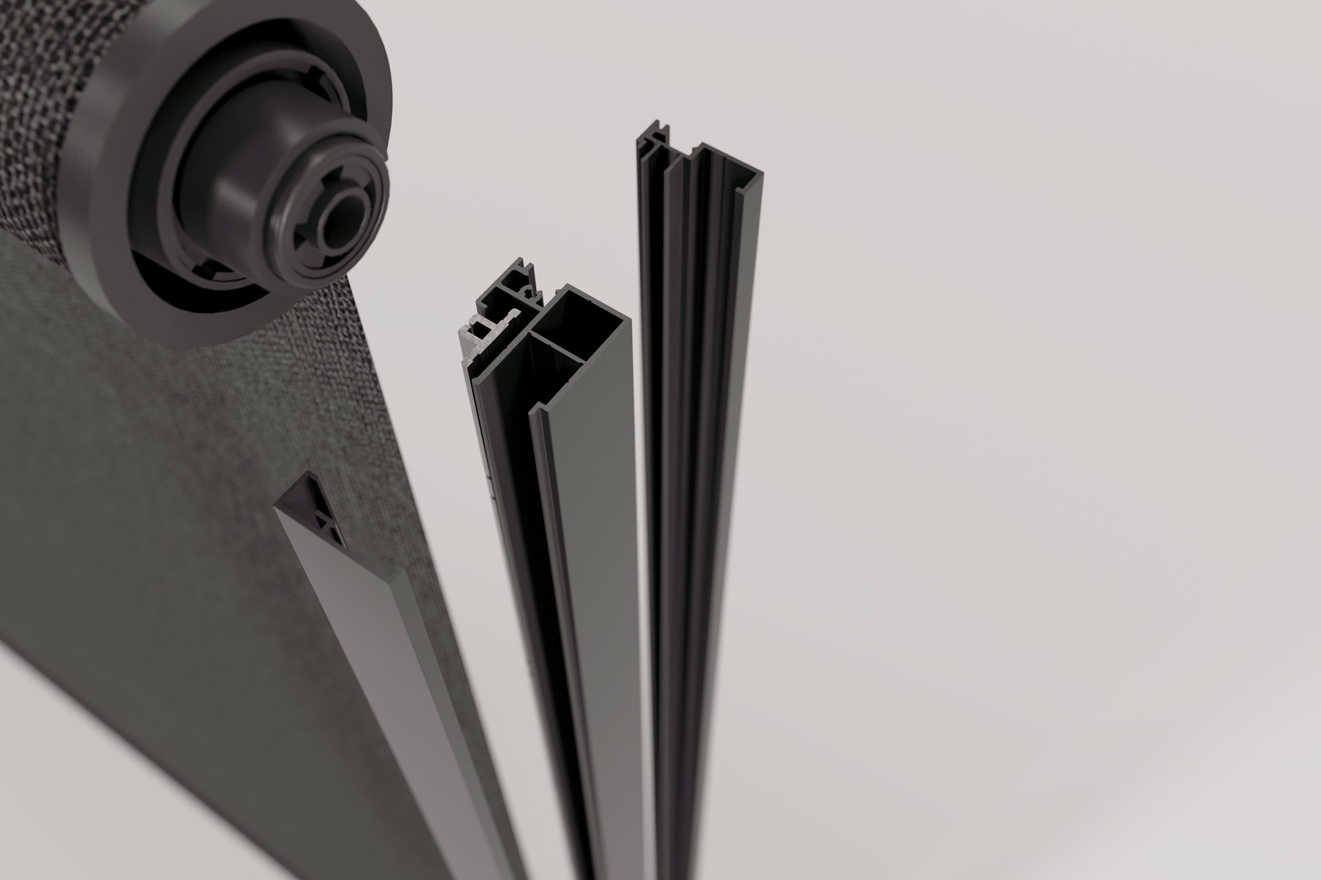 « Harol Screen » possède un design minimaliste du caisson et des coulisses (sans vis et avec une lame finale intégrée qui disparaît (partiellement) dans le caisson), qui offre aux concepteurs de nombreuses possibilités créatives. Avec Harol Coolscreen, la soudure au niveau de la lame finale devient en outre invisible. De plus, la technologie Harol X-Glide améliorée garantit un fonctionnement encore plus silencieux (résonance réduite) et peut être connectée à des systèmes domotiques. Les installateurs se voient offrir un plus large éventail de possibilités, avec moins de pièces. Des pièces qui ont par ailleurs été réduites au strict minimum en termes de dimensions. Le concept Coolscreen se présente sous la forme d’un kit de construction modulaire. Il est composé d’une seule lame finale (37 mm), de deux coulisses latérales divisibles dotées d’un système de clic fonctionnel (35 mm), d’une coulisse centrale (55 mm) et de deux modèles de caisson (arrondi et carré avec des côtés visibles de 95 mm, 115 mm et 140 mm).
