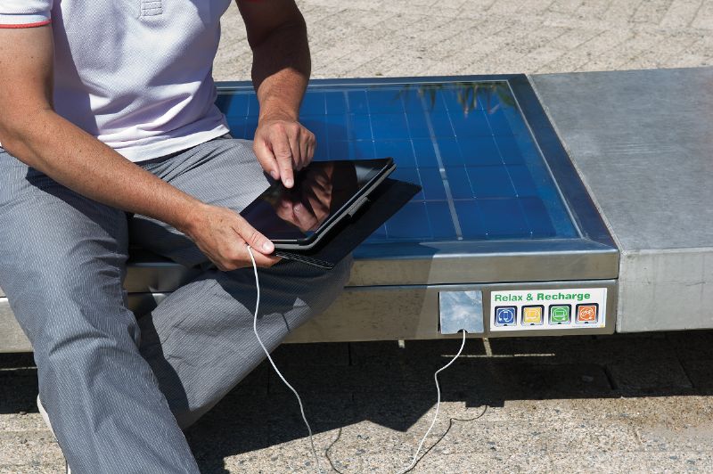 La gamme de mobilier urbain Solar est une collection de bancs et de tables munis de panneaux photovoltaïques intégrés, qui convertissent l’énergie solaire captée en électricité verte pouvant servir à recharger des téléphones mobiles, des tablettes, des ordinateurs portables et même des vélos électriques. Hasselt, auréolée du titre de « smartest city » du pays l’année dernière, est désormais la première ville belge à mettre un banc Solar en service.