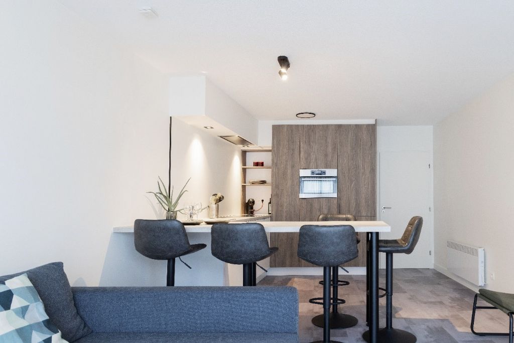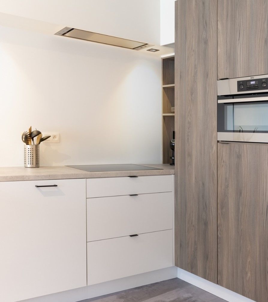 Pour les armoires murales, on a opté pour un décor bois à structure synchrone, qui est parallèle au dessin du bois dans le décor. De cette façon, vous obtenez non seulement l'aspect du bois, mais aussi le relief et la sensation du bois massif. Inutile de dire que cela donne à cette cuisine un aspect instantanément plus chaleureux ? Nous voyons également la structure synchrone se refléter dans un meuble TV dans le salon ouvert et dans des armoires dressing dans les chambres. En combinant différentes teintes de bois dans le même intérieur, vous obtenez un résultat ludique mais naturel. La finition totale forme un ensemble raffiné et harmonieux dans lequel tout se correspond. Cela montre immédiatement l'importance de l'unité dans les couleurs et les structures du HPL et de la mélamine.