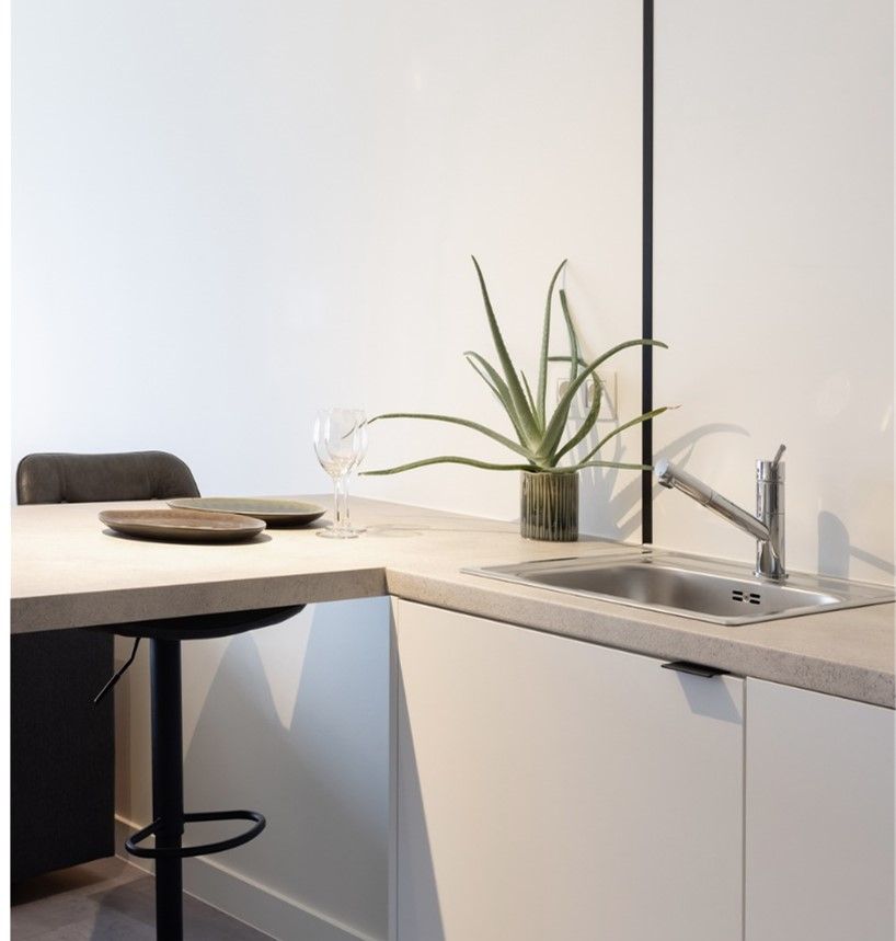 Pour souligner la polyvalence d'une collection complémentaire, Triplaco a réalisé un projet d'intérieur avec sa collection (voir photos), dans laquelle soit HPL sur différents matériaux de base, soit un panneau d’agglo mélaminé soit un plan de travail postformé pourrait être utilisé pour chaque application. Par exemple, pour le plan de travail postformé de cuisine, un aspect béton tendance a été choisi. Ce décor a également été étendu au plateau de table à côtés droits, où un HPL identique a été utilisé. La finition spécifique de ce décor - qui se reflète à la fois dans le plan de travail et le plateau de table - donne à cet aspect béton épuré une chaleureuse sensation de profondeur. Les placards au fond de l'évier ont été maintenus en blanc sobre. Ici aussi, le choix s'est porté sur un assemblage en HPL pour les façades des armoires et en mélamine pour l'intérieur des armoires.