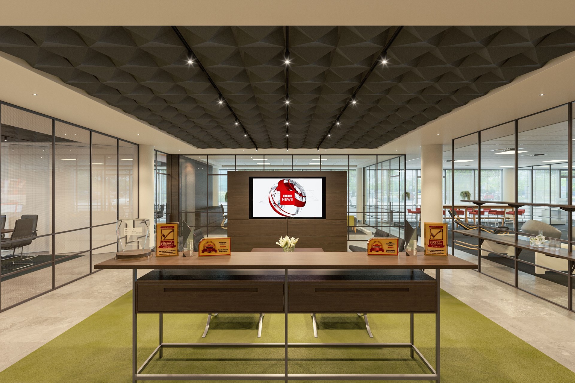 chargé de fournir environ 100 m2 de ses panneaux HeartFelt® Origami en 400 mm x 400 mm en gris moyen 7597. Ces derniers seront également équipés d’un rail d’éclairage intégré noir avec des spots noirs.