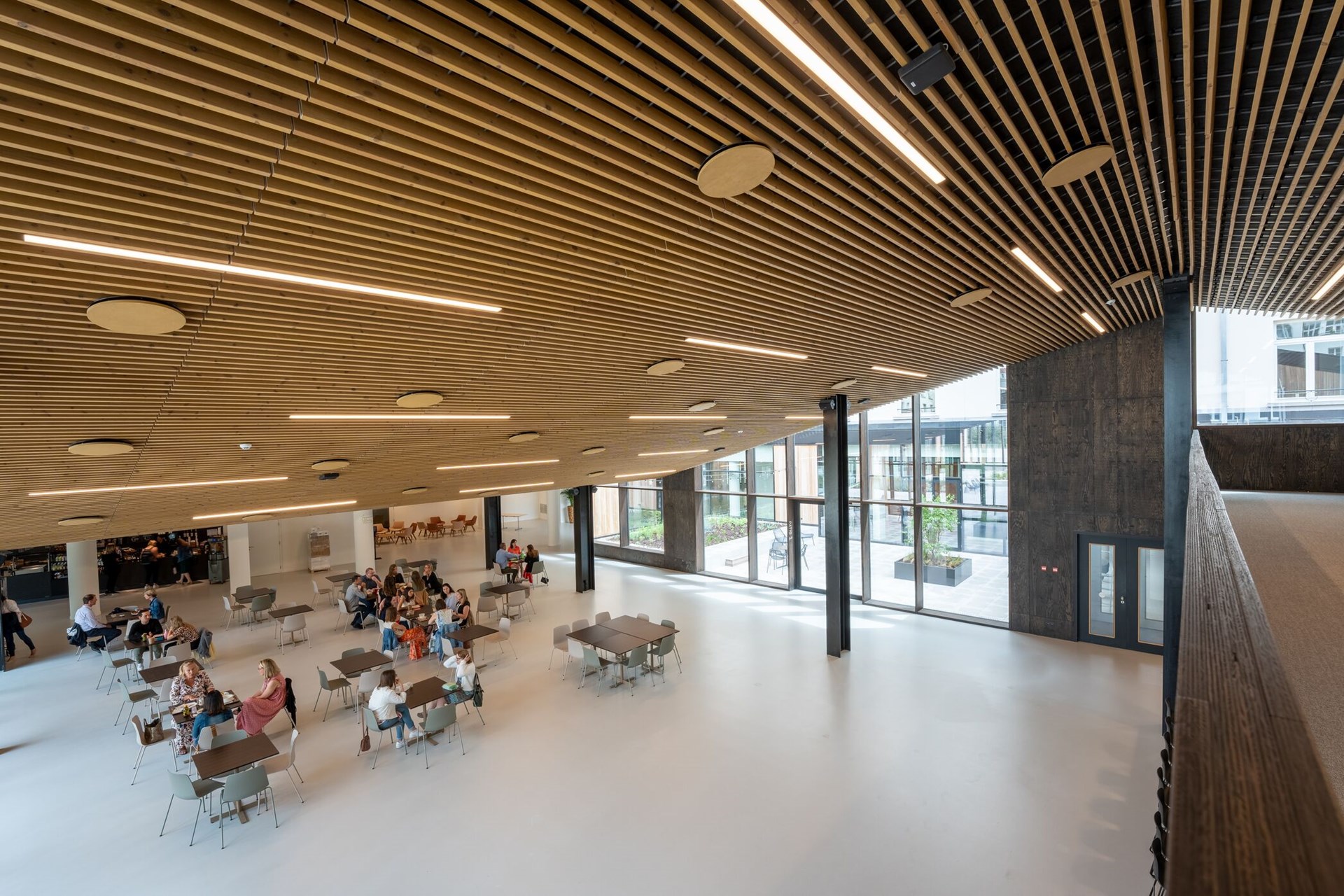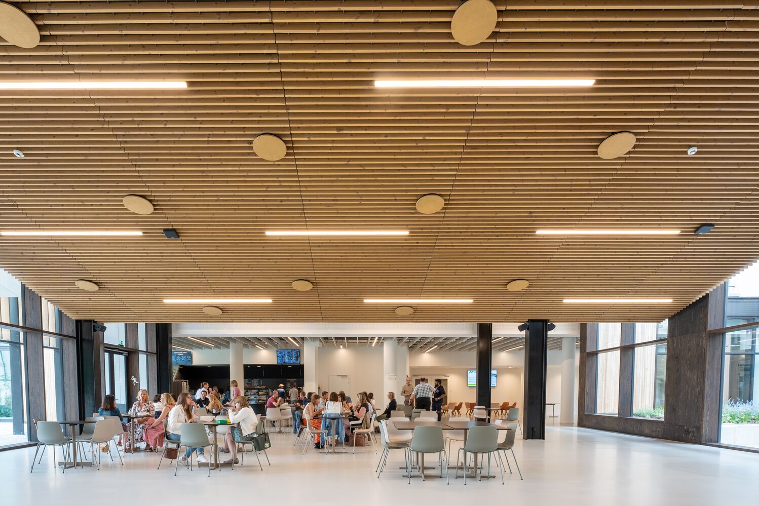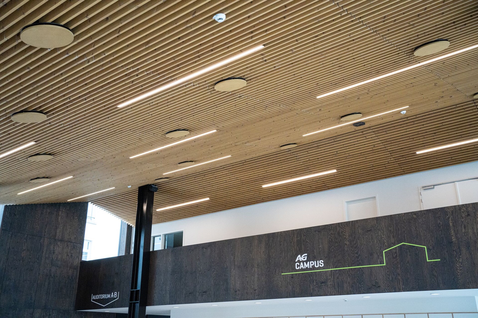 Hunter Douglas Architectural a fourni le plafond intérieur du campus, composé des lattes de bois massif fixés les unes aux autres par des tourillons en acier. Le plafond du gril a un caractère ouvert, ce qui signifie que le bruit ambiant est très bien absorbé lorsque des tapis isolants sont utilisés.
