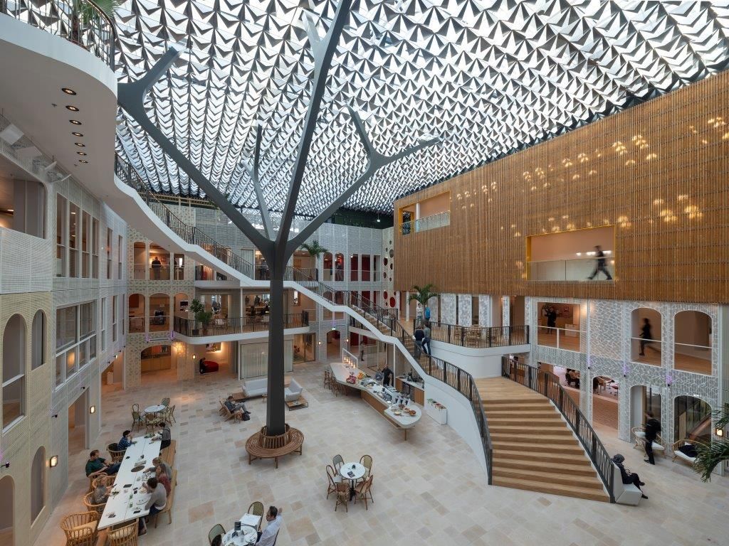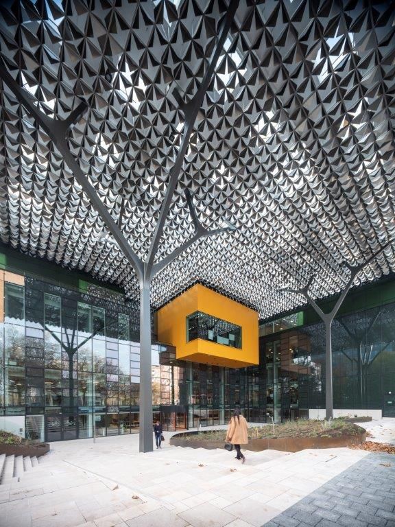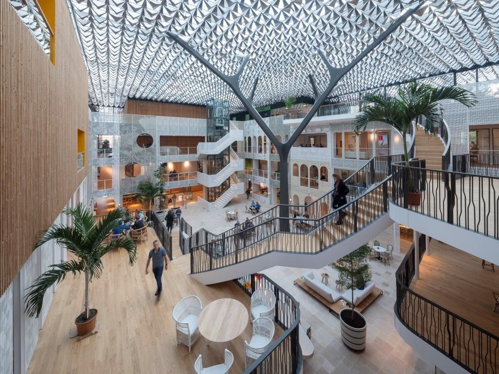 Le motif de feuilles d'arbres au plafond imaginé par les architectes vise à créer une luminosité ressemblant à celle d'un environnement naturellement ombragé. Pour réaliser ce rendu esthétique particulier, Hunter Douglas a conçu et fabriqué un plafond de 3500 m², en panneaux aluminium recyclés composés chacun de 4 dalles carrées de 650 mm de côté fixées dans des profilés aluminium. Le motif se compose de 4 feuilles triangulaires pliées vers le bas dans des angles différents, et fixées au plafond sous 58 compositions différentes. Ce plafond rejoint les colonnes métalliques de la structure portante à l'intérieur et à l'extérieur du bâtiment, colonnes qui présentent la forme capricieuse d'arbres et de branches.