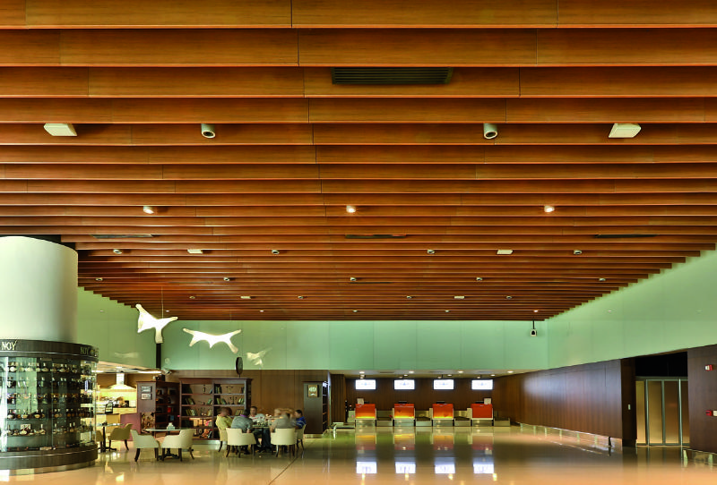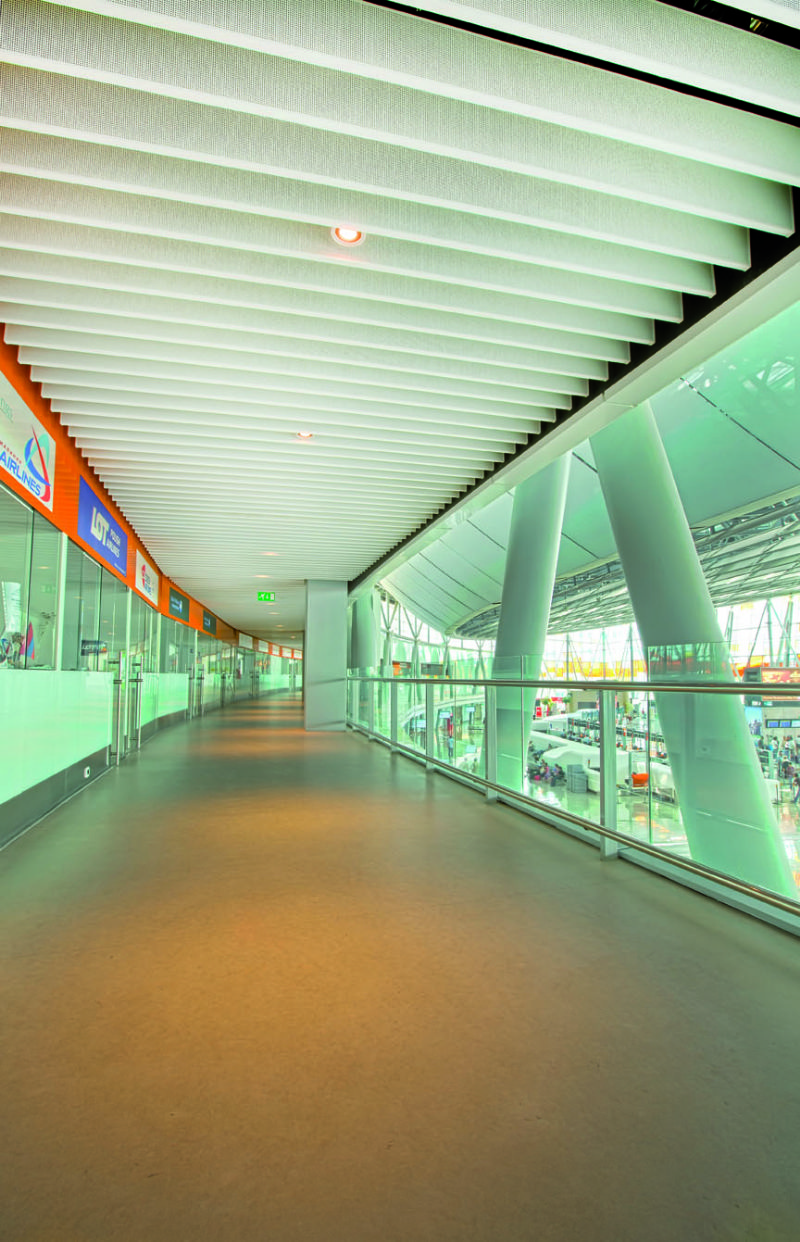 Ce dispositif accorde beaucoup de liberté de manoeuvre aux architectes : il existe 45 schémas de perforation et une grande diversité de largeurs et de hauteurs. Sans parler des couleurs, disponibles dans n'importe quelle tonalité RAL, en plus d'une finition bois. Baffle Ceiling convient pour les locaux avec de hauts espaces, comme les aéroports. Il est entre autres utilisé dans la business lounge de Brussels Airlines.