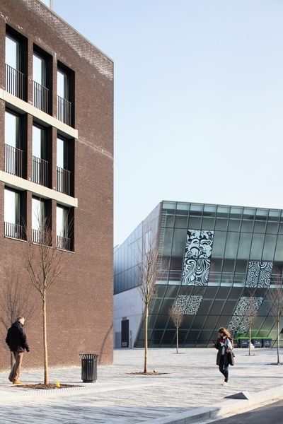 L’image du bâtiment devait correspondre à la fois aux attentes d’une clientèle amatrice d’espaces qui se distinguent, mais elle devait aussi donner bonne mesure à la dimension plus institutionnelle, monumentale et culturelle du contexte. La structure en brique répétitive venait ainsi répondre à l’objectif de monumentalité et d’urbanité en formant une façade pour l’espace extérieur, tandis que la façade vitrée en retrait, volontairement discrète, permettait de créer un espace intermédiaire et pouvait correspondre plus librement aux découpages internes. La couleur choisie par le bureau permettait d’obtenir un jeu de clair-obscur dans lequel la domesticité s’effaçait au profit de la cohérence de l’espace extérieur. Le discours sur la double peau, son apparence et son rôle spatial, sont donc fondamentalement constitutifs d’un projet qui, rappelons-le, réintroduit le logement en zone d’équipement.
