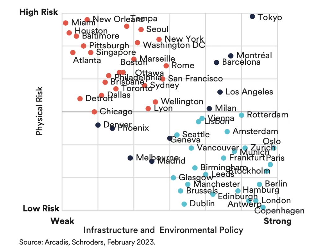 L’analyse des seuls risques physiques ne tient pas compte des facteurs socio-économiques généraux qui peuvent renforcer ou entraver la résilience d’une ville face aux risques physiques. Il convient également de se demander si la ville a déjà mis en place des infrastructures résilientes ou si elle prévoit de le faire. La figure ci-dessous compare le risque de conditions météorologiques extrêmes avec le degré de préparation de 59 grandes villes des économies développées. Le score de préparation est basé sur un classement des infrastructures municipales et des politiques environnementales élaboré par le Sustainable Cities Index d’Arcadis.