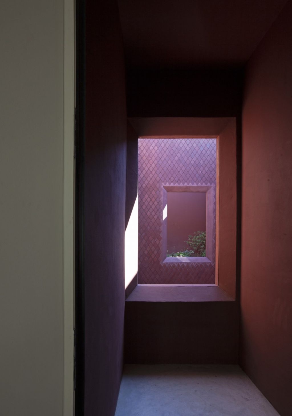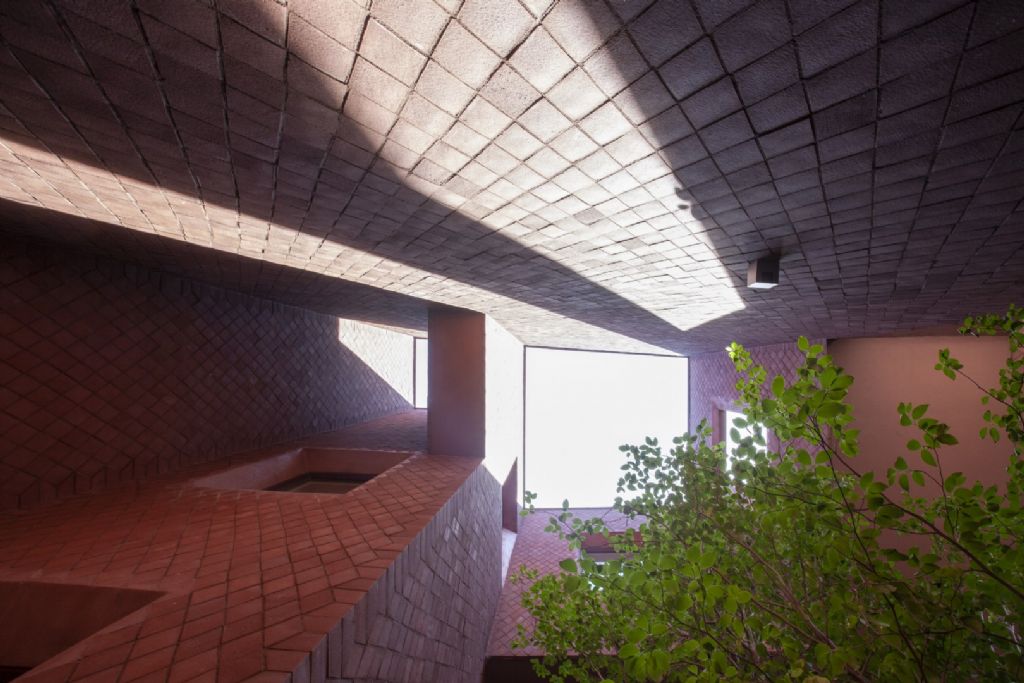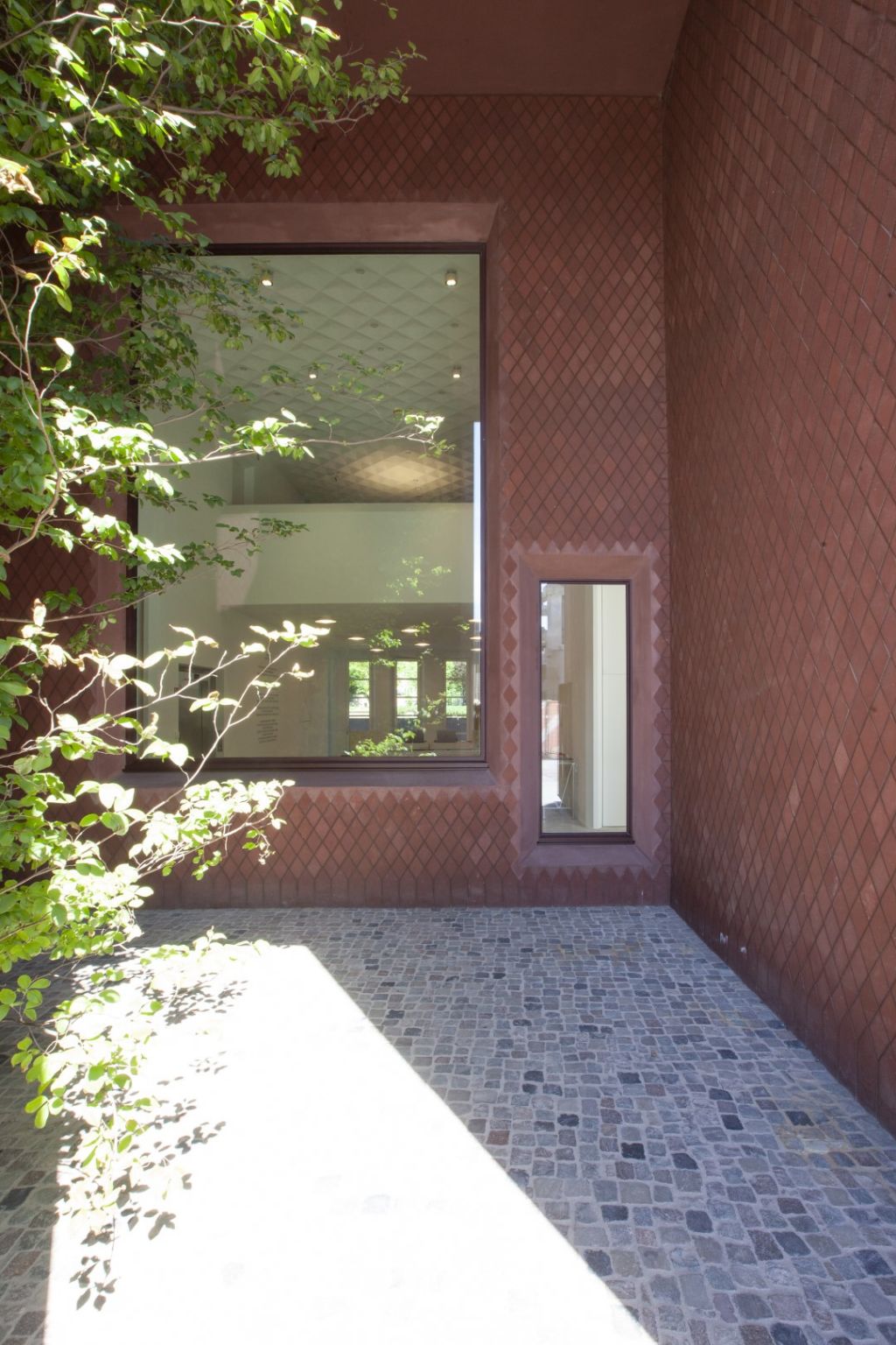 À l’intérieur, l’architecte italienne Francesca Torzo a joué avec les volumes. Les grandes salles alternent avec les petites. Une pièce est très lumineuse, l’autre est relativement sombre. Ici aussi, on retrouve régulièrement un clin d’œil à la façade avec des plafonds losangés.