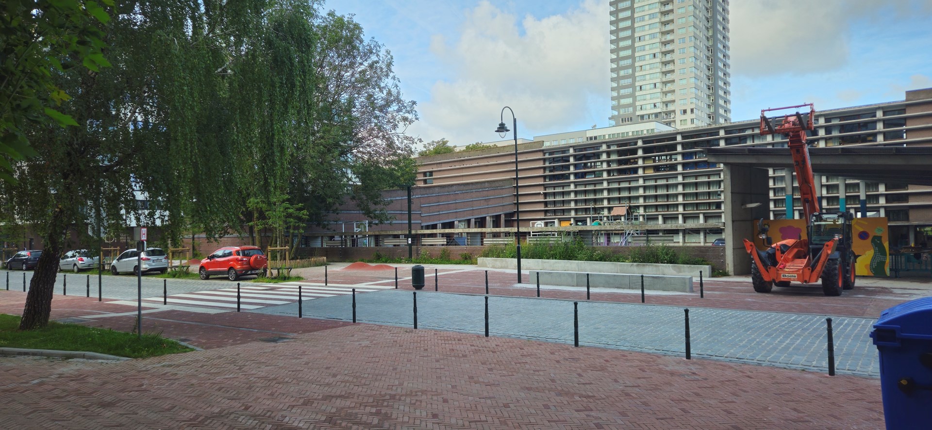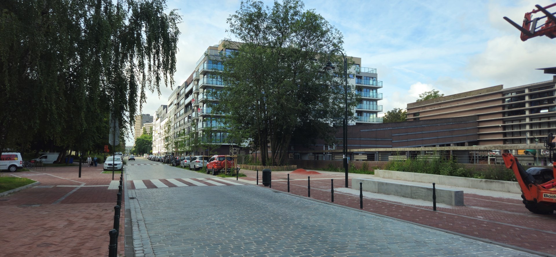 Le parvis a transformé une partie de l’avenue de l’Héliport, à hauteur de l'école Klavertje Vier, en une zone à faible circulation automobile. La circulation est apaisée grâce à un rétrécissement de la chaussée et de trottoirs élargis. Ce réaménagement offre ainsi plus d'espace aux piétons et aux enfants, créant un environnement à la fois agréable et sécurisé. L'ajout de 16 nouveaux arbres et la création d'un parcours ludique pour les vélos et les trottinettes font de cet espace un lieu non seulement fonctionnel, mais aussi vert et accueillant pour les plus jeunes. Une escalier majestueux relie le parvis à la cour intérieure des logements du Foyer Laekenois, renforçant ainsi l'accessibilité et l'interaction sociale dans le quartier.