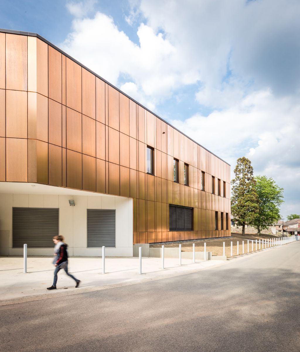 La future clinique comprend 4 pôles principaux liés à la santé : les consultations (partie accessible au public), l’imagerie médicale (radiologie, IRM, etc.), l’hospitalisation (bloc opératoire comportant 5 salles) et l’unité de soins intensifs. Cette organisation est complétée par un pôle administratif (zones dédiées aux bureaux et à l’équipement de type tertiaire) et un espace dédié à l’internat (12 chambres individuelles). Des espaces techniques et logistiques complètent la programmation. Le projet comporte également la construction de 2 parkings (clientèle et personnel), établis en surface. Le bâtiment respecte un gabarit volontairement bas (R+1) couvert par des toitures plateformes. Il est installé sur un « socle technique » partiellement contre terre, qui constitue le niveau -1. L’ensemble épouse au mieux le relief du terrain naturel. Les façades sont réalisées en cuivre, matériau noble, aisément recyclable et ne nécessitant que très peu d’entretien. Les toitures sont en majorité végétalisées. Les parties non végétalisées sont équipées de panneaux solaires photovoltaïques.