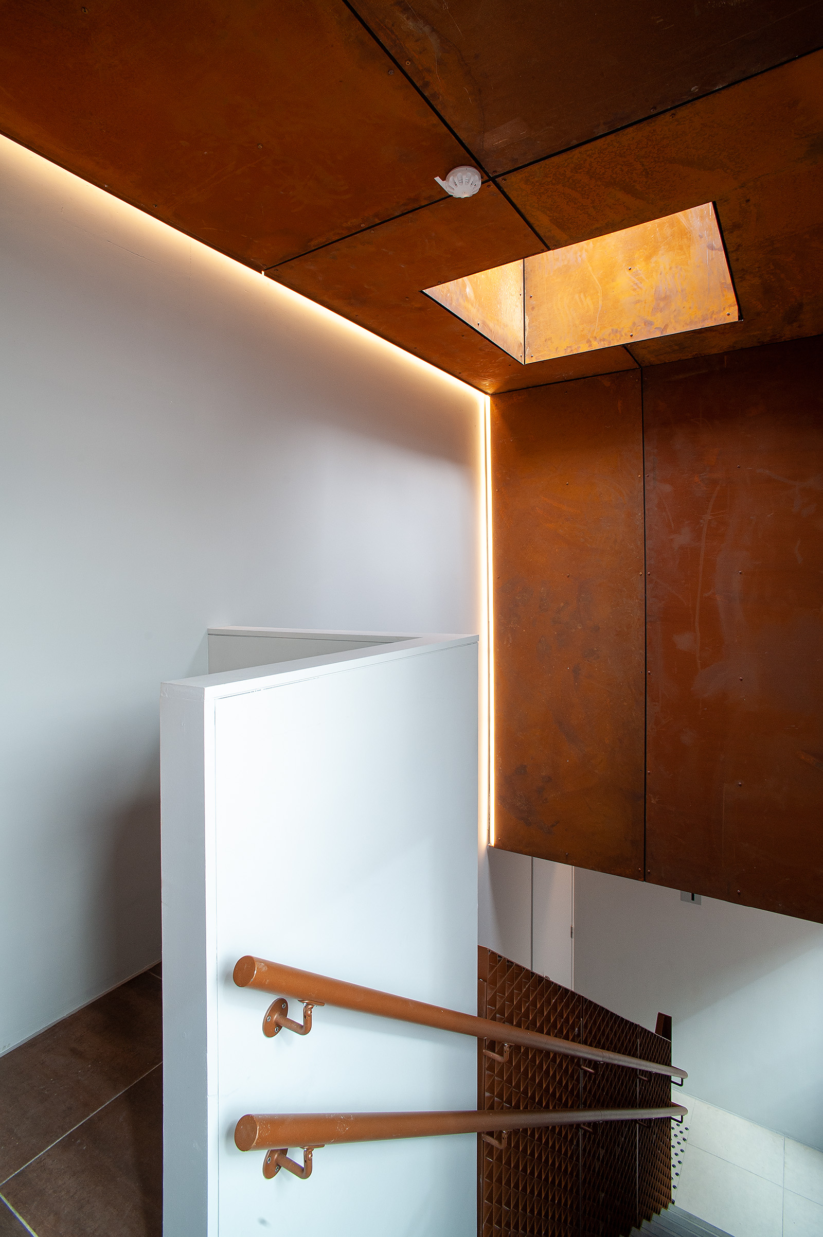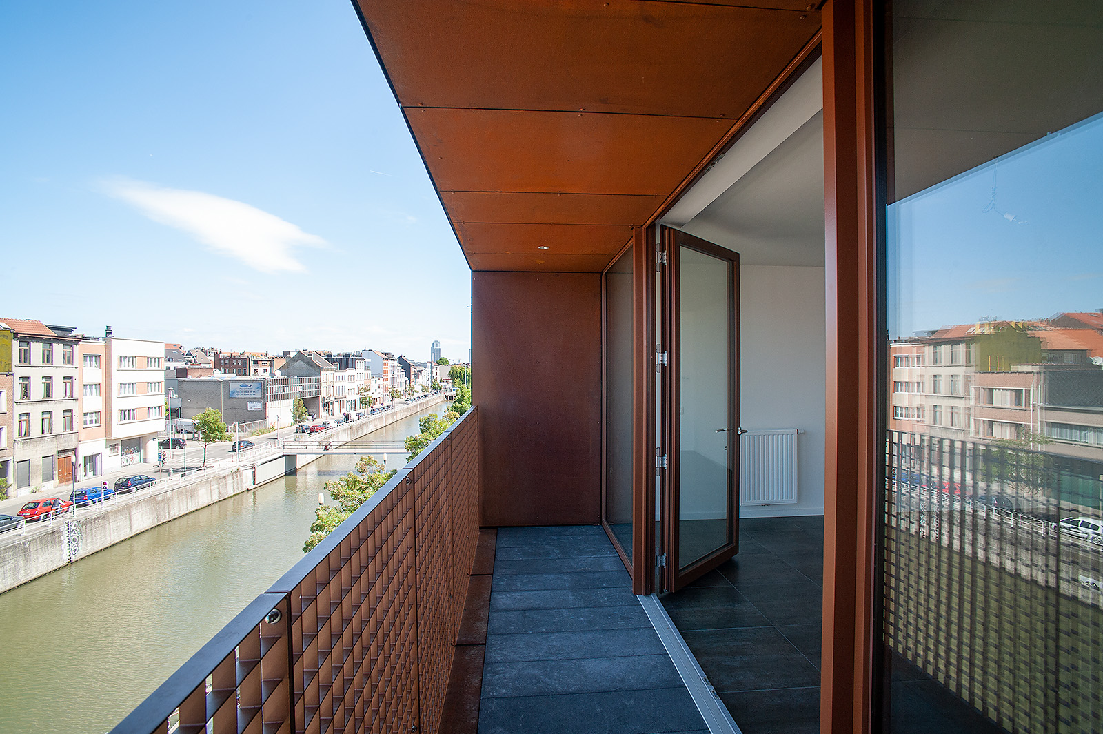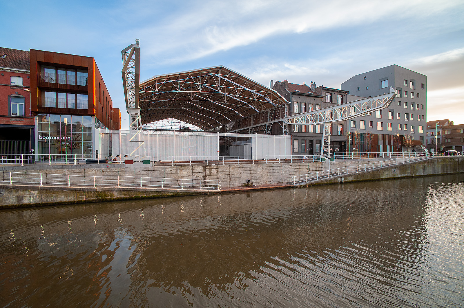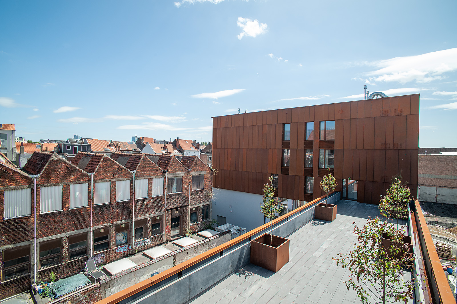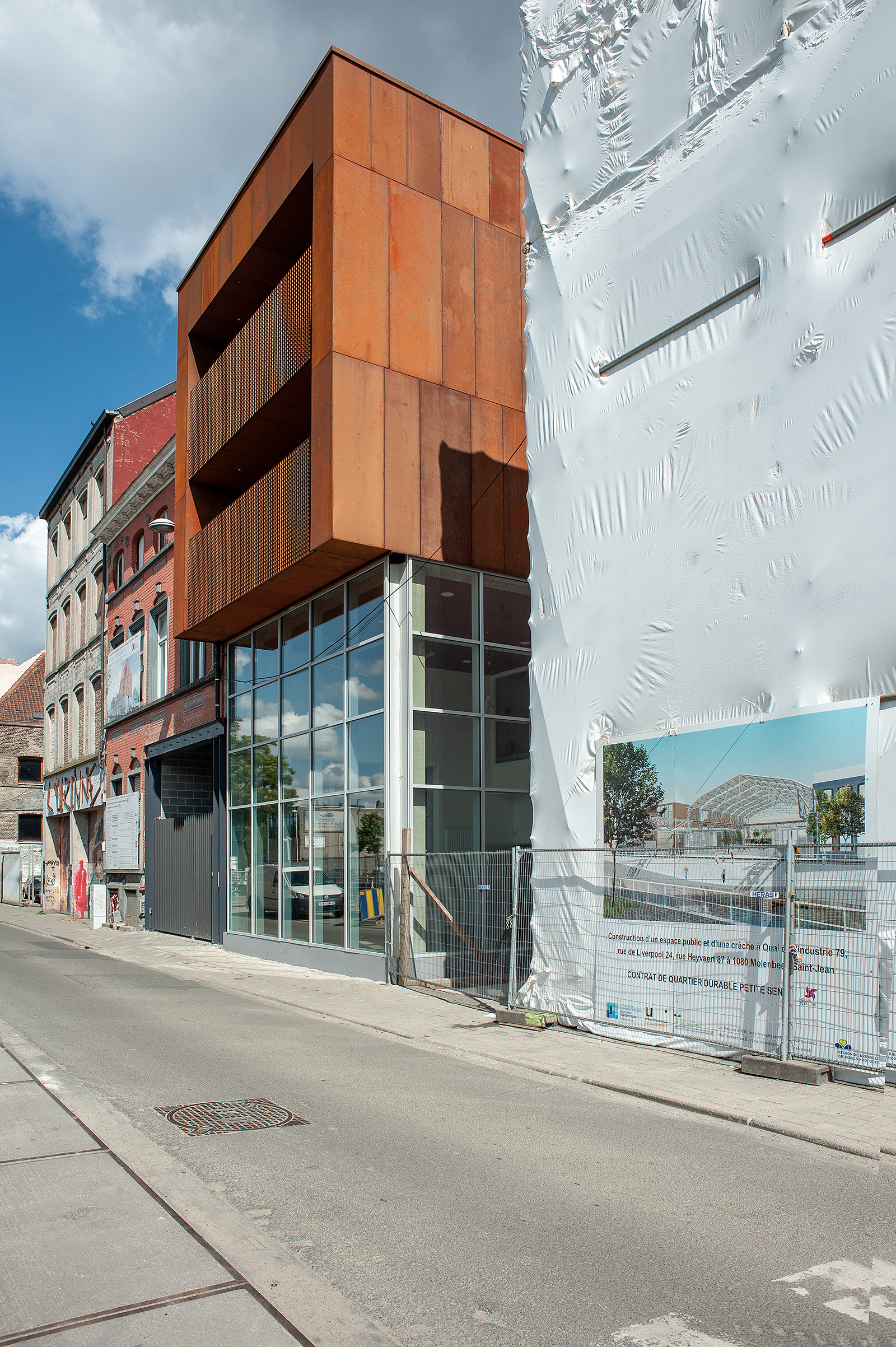 Dans ce contexte dense et diversifié, le projet singulier, compact et lisible développe un front bâti en L sur le nouvel espace public et intensifie les relations entre le canal, la rue Heyvaert et la Grande Halle, lieu couvert, récréatif et d’échange. Les ateliers, par la transparence de leur façade vitrée sur 5,5 m de haut, animent les espaces publics et la cour de travail intérieure. Les logements s’en distinguent par une façade d’acier corten, nuancée, texturée, en écho au caractère industriel du lieu, et une composition de rythme et d’échelle résidentielle. Un projet dessiné par B612associates.