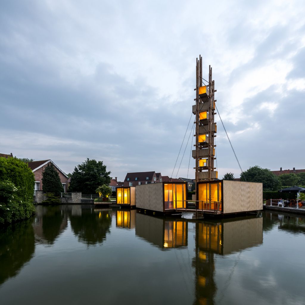 INFINITI²³ est l'un des projets phares de la Triennale de Bruges. L'élément le plus remarquable de cette œuvre d'art réside dans le fait que la tour, qui se compose de plusieurs capsules compactes, pourra être totalement adaptée aux besoins de demain. Lorsque le niveau de l'eau montera et atteindra le bloc suivant, ce dernier se détachera pour ensuite continuer à fonctionner de manière autonome sur l'eau.