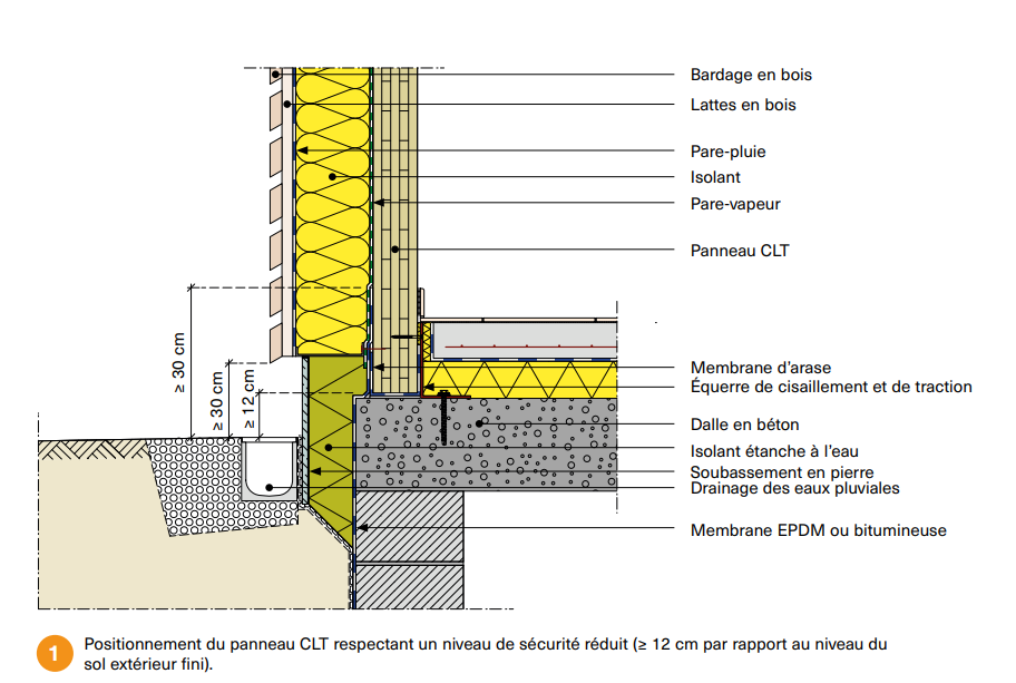 Pour transmettre les efforts, les panneaux CLT doivent être fixés dans le radier ou dans la semelle de fondation. Il n’est pas indispensable de prévoir une lisse basse. Néanmoins, lorsque des isolants rigides tels que le béton cellulaire, les blocs silicocalcaires ou le verre cellulaire sont placés sous les panneaux, une lisse est nécessaire pour caler les panneaux et éviter de poinçonner les isolants. Il existe des lisses de section L ou T permettant une liaison plus aisée avec les panneaux. Par défaut, on positionnera la lisse basse ou la partie basse des panneaux CLT à minimum 20 cm au-dessus du sol extérieur fini. Ce niveau de sécurité peut être réduit, sans toutefois être inférieur à 12 cm (voir figure ci-dessous), si l’on veille à ce que :