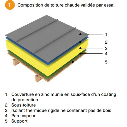 (*) Une toiture chaude en zinc est une toiture dans laquelle l’isolant et l’étanchéité sont directement positionnés l’un contre l’autre, sans aération en sous-face du zinc.