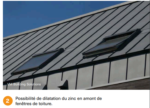 - d’apporter une attention particulière à la conception et à la réalisation des détails, afin de garantir une étanchéité parfaite à long terme. On veillera spécifiquement à la libre dilatation des bandes de zinc au droit des émergences (cheminées, fenêtres de toiture, …) (voir figure 2).
