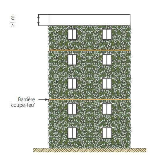 - veiller à ce qu’il y ait une distance horizontale suffisante (minimum 40 cm) entre les ouvertures et la façade végétalisée pour éloigner les plantes des flammes s’échappant par les fenêtres