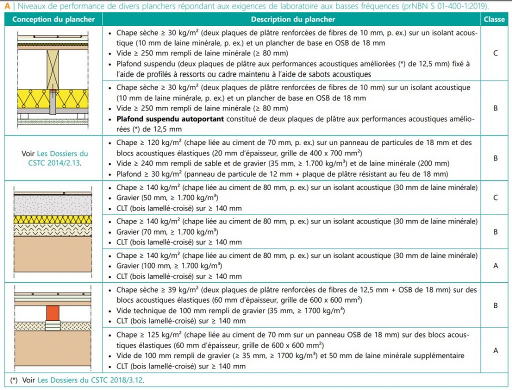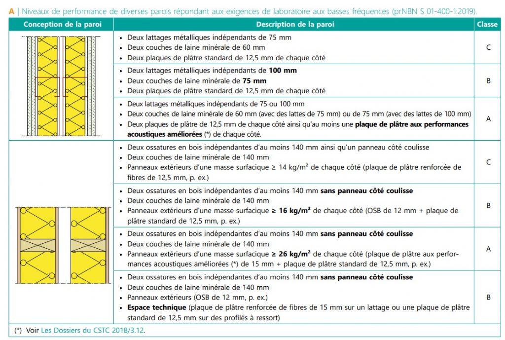 La version révisée de la norme NBN S 01-400-1 de 2008, actuellement intitulée prNBN S 01-400-1:2019, définit trois classes de performance : A, B et C, où la classe A est meilleure que la C. La classe C pour les appartements remplace ainsi l’actuel ‘confort acoustique normal’ comme niveau de performance minimum requis et la classe B remplace le ‘confort acoustique supérieur’. Les structures séparant deux nouvelles habitations mitoyennes devront au moins répondre aux exigences performancielles de la classe B.