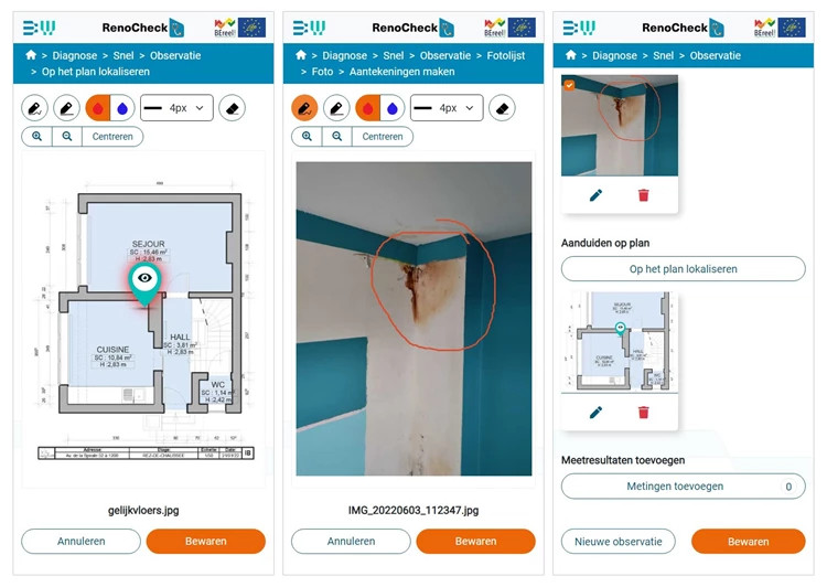• un diagnostic détaillé, qui permet d’obtenir l’état ‘sanitaire’ de chaque composant de façon plus exhaustive. L’application regroupe l’ensemble des questions nécessaires à l’élaboration d’un diagnostic complet. C’est une check-list adaptative qui guide l’utilisateur à travers diverses étapes. Ce diagnostic détaillé distingue les dégradations d’ordre mécanique (fissures, …), biologique (lichen, moisissures, …) ou celles causées par l’humidité ou liées à la présence de substances dangereuses (amiante, …).
