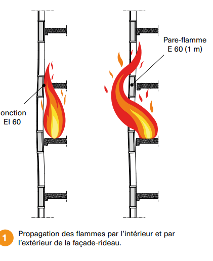 - que la façade comporte un élément pare-flamme de résistance au feu E 60 d’une longueur développée de 1 m au droit de chaque plancher de compartimentage (1)